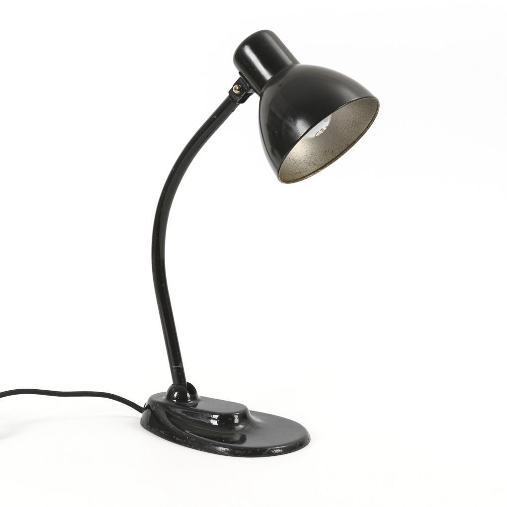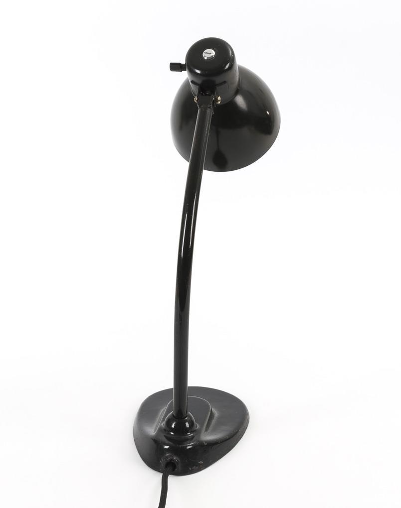 Moderne Schreibtischlampe mit Gelenkarm und beweglichem Lampenschirm im Bauhaus-Design. Sogenanntes "Modell der 4. Generation", dessen Bewegungsbereich und Standfestigkeit durch Anpassung des Fußes, des Fußgelenkes und des Tragarmes enorm vergrößert werden konnte. Alters-/Gebrauchsspuren, neu verschraubt (Kandem Schutzmarke ergänzt), neu verkabelt und funktionstüchtig.
