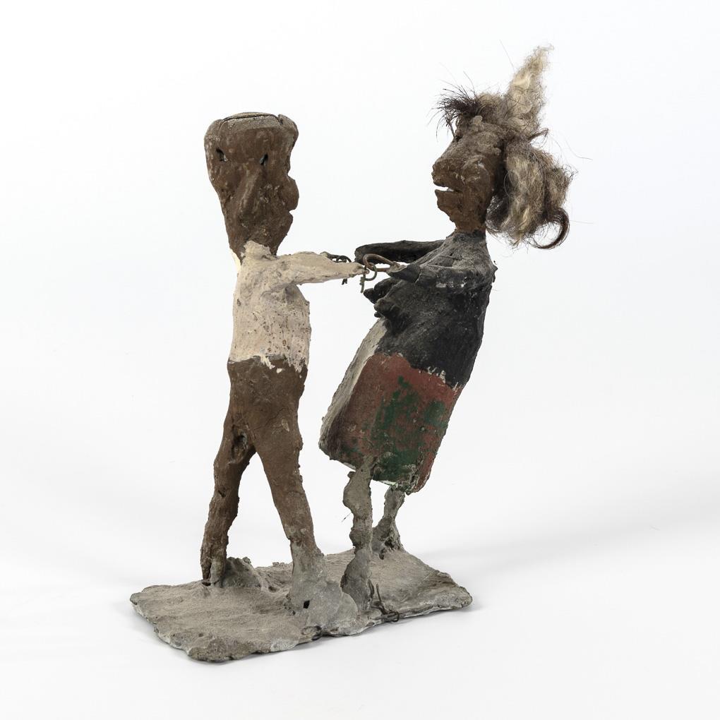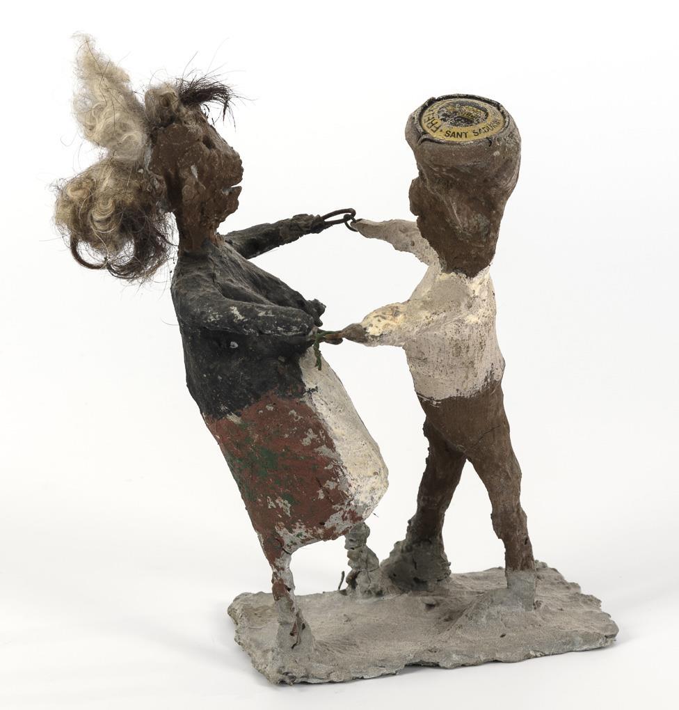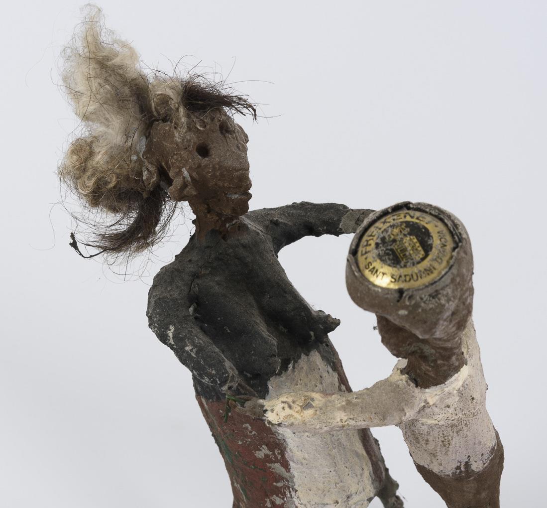 Zement bemalt, Eisendraht und Kunststoff, Haare, Weinkapsel. H 16,5 cm.