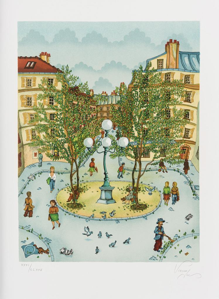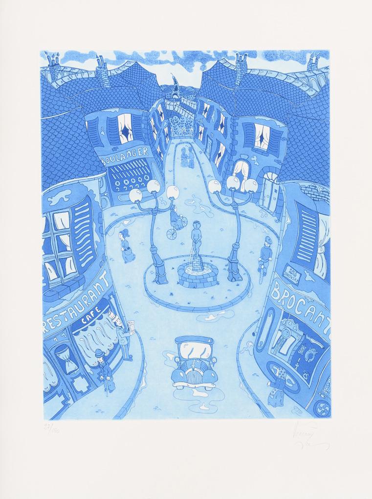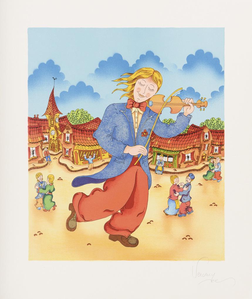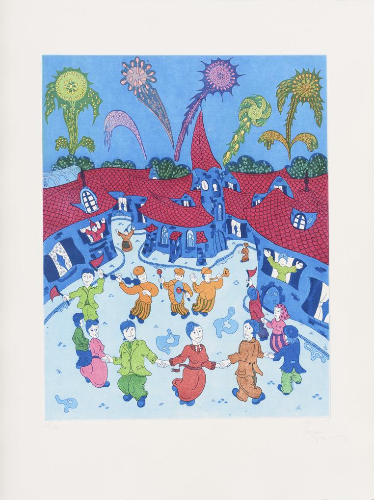 Straßenmusikant, Farbsiebdruck auf Bütten, Blatt: 49 x 42 cm | Ballonfahrt, Farbsiebdruck auf Bütten, Blatt: 54,3 x 42 cm, Exemplar: 140/175 | Straßenfest, Farbradierung auf Arches-Bütten, Blatt: 66,5 x 50,5 cm, Exemplar: 28/150 | Straßenszene, Farbradierung in Blau auf Arches-Bütten, Blatt: 65,7 x 50 cm, Exemplar: 27/150, Ecke oben links mit Knick | Straßenszene, Farbsiebdruck auf BFK-Rives-Bütten, Blatt: 75,7 x 56 cm.