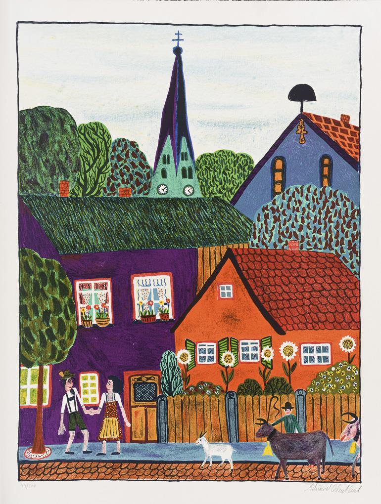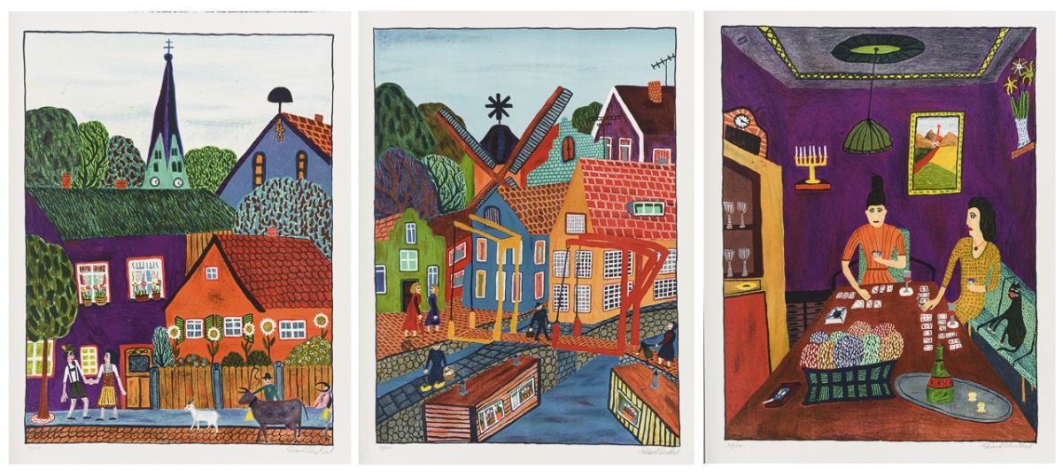 Ansicht eines belebten Dorfes, Exemplar: 44/200, im oberen Randbereich etwas griffspurig | Zwei Damen beim Kartenspiel, Exemplar: 44/200, kleiner Farbfleck unten rechts | Stadtansicht mit Kanal und Brücke, Exemplar: 44/200.