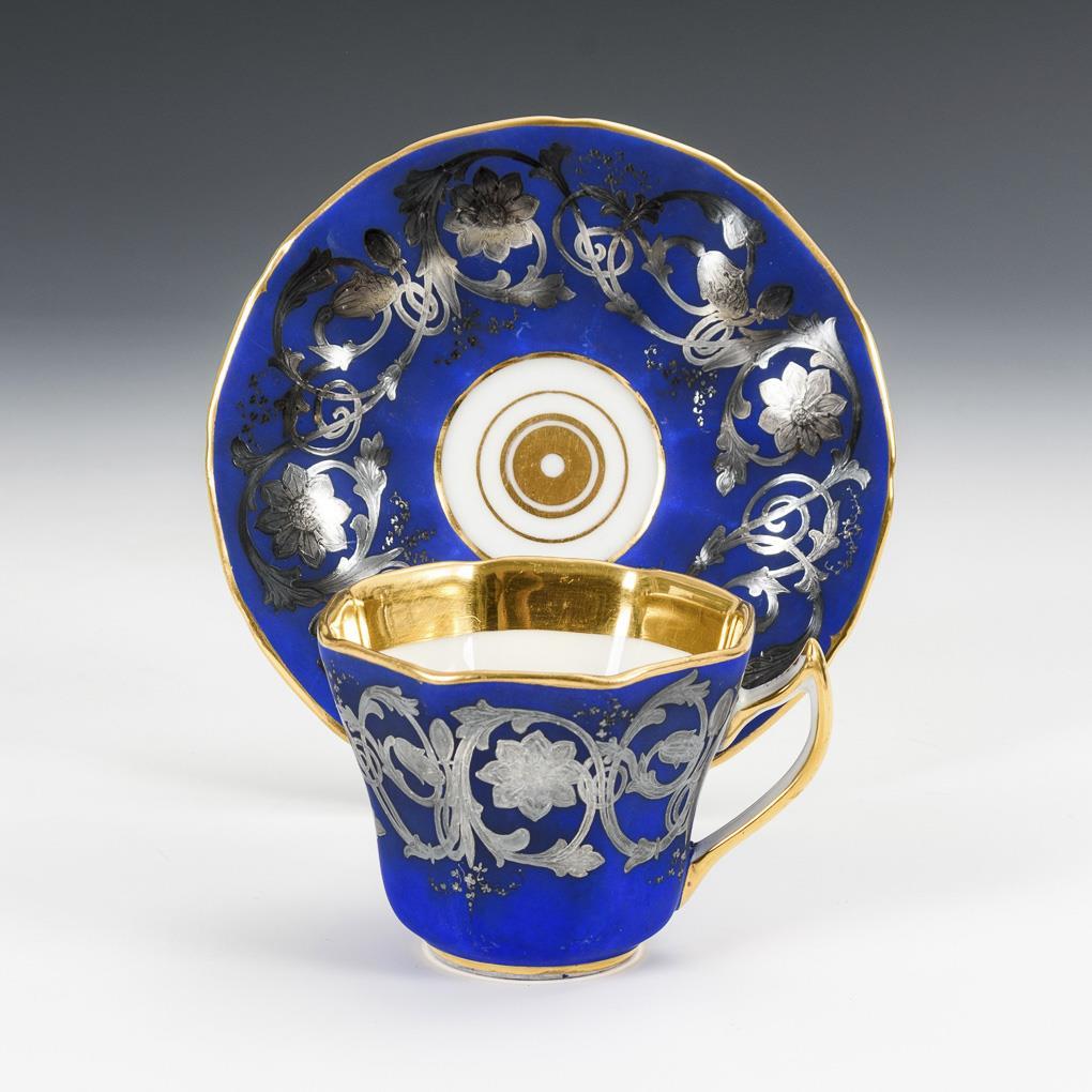 Kobaltblauer Powderfond, Silber- und Goldstaffage. H Tasse 7,5 cm, Ø originale Untertasse 15,5 cm.