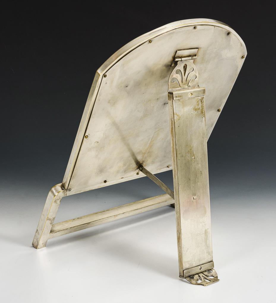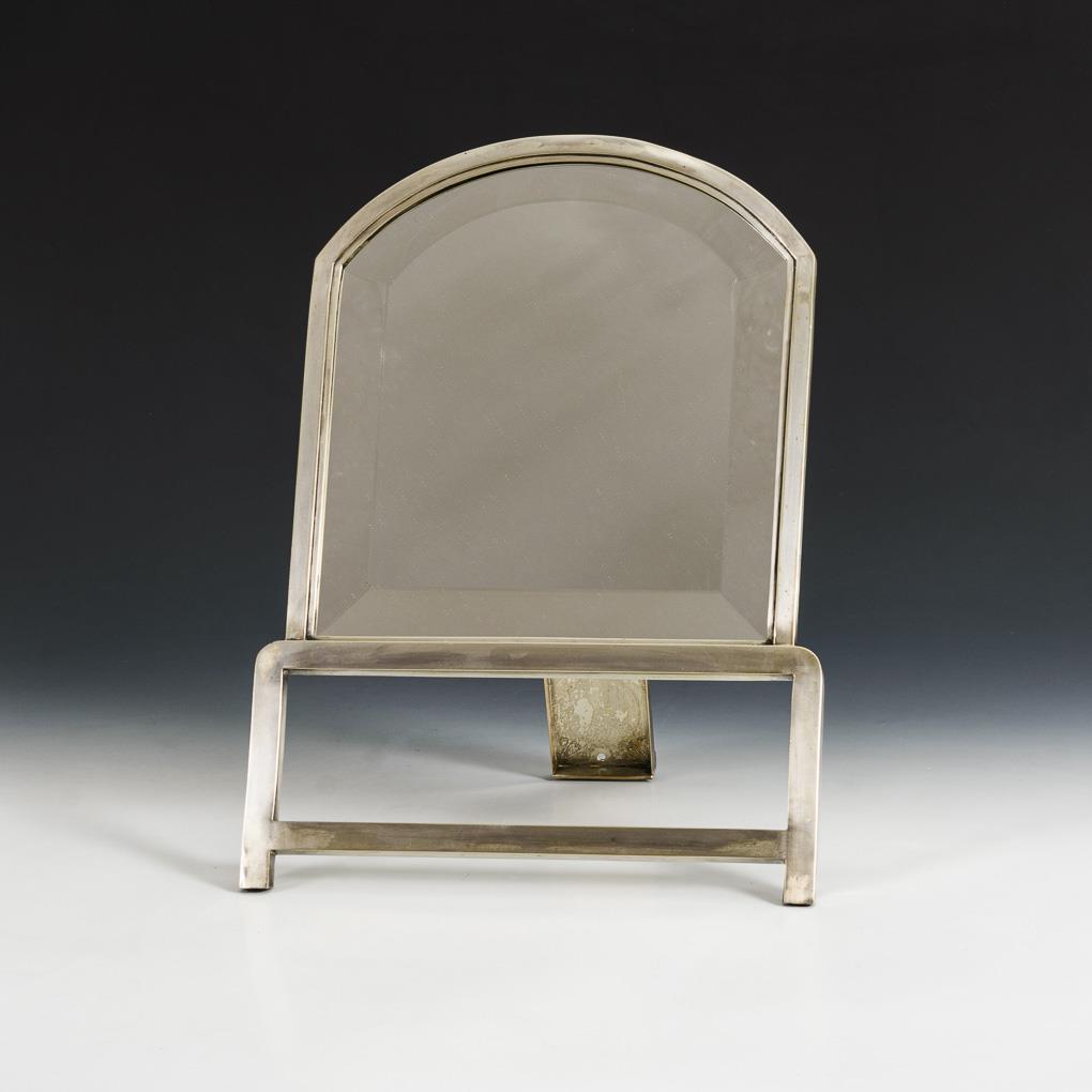 Facettierter Spiegel mit Stabfuß und Segmentbogen-Abschluss sowie arretierbarem Aufsteller. Wenige Alters-/Gebrauchsspuren.