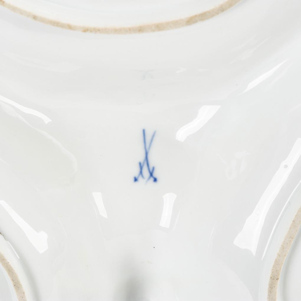 Dreiteilige Muschelschale mit Fruchtbuketts im Spiegel. Unterseitig ein kleiner Brandriss.