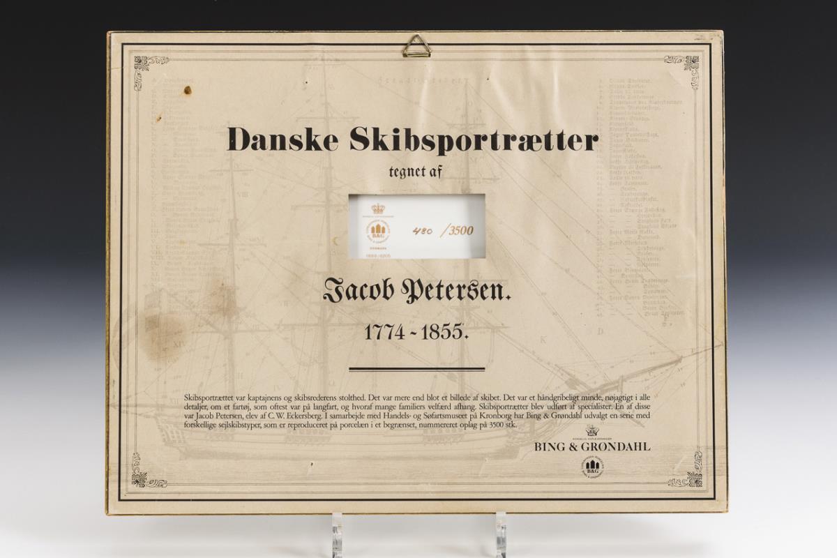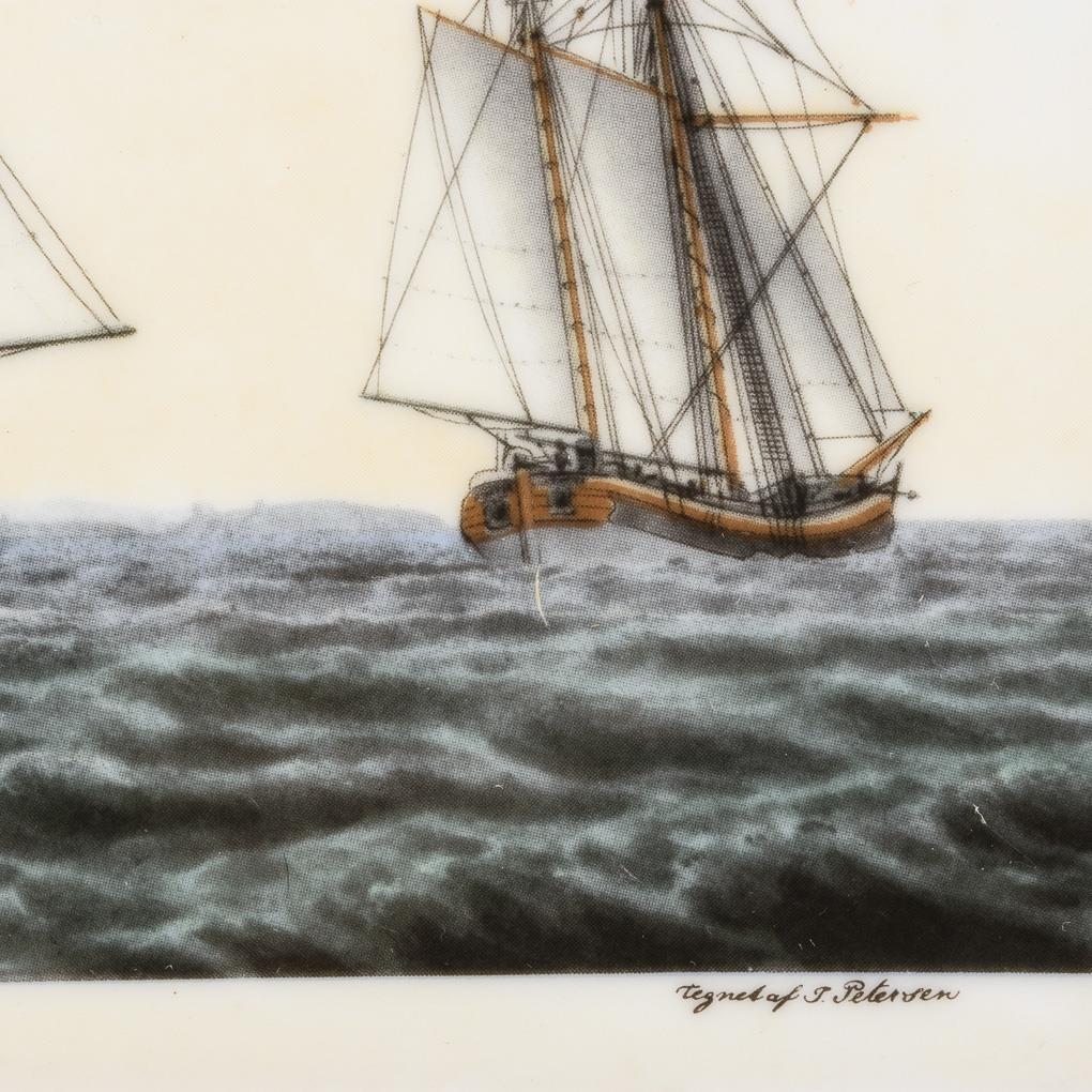 Rechteckige Platte mit der Darstellung zweier Segelschiffe unter dänischer Flagge, bezeichnet "Haabet af Kiöbenhavn fört af Capt. C. Christiansen an 1840", nach einem Kapitänsbild des Malers Jacob Petersen (1774-1855).