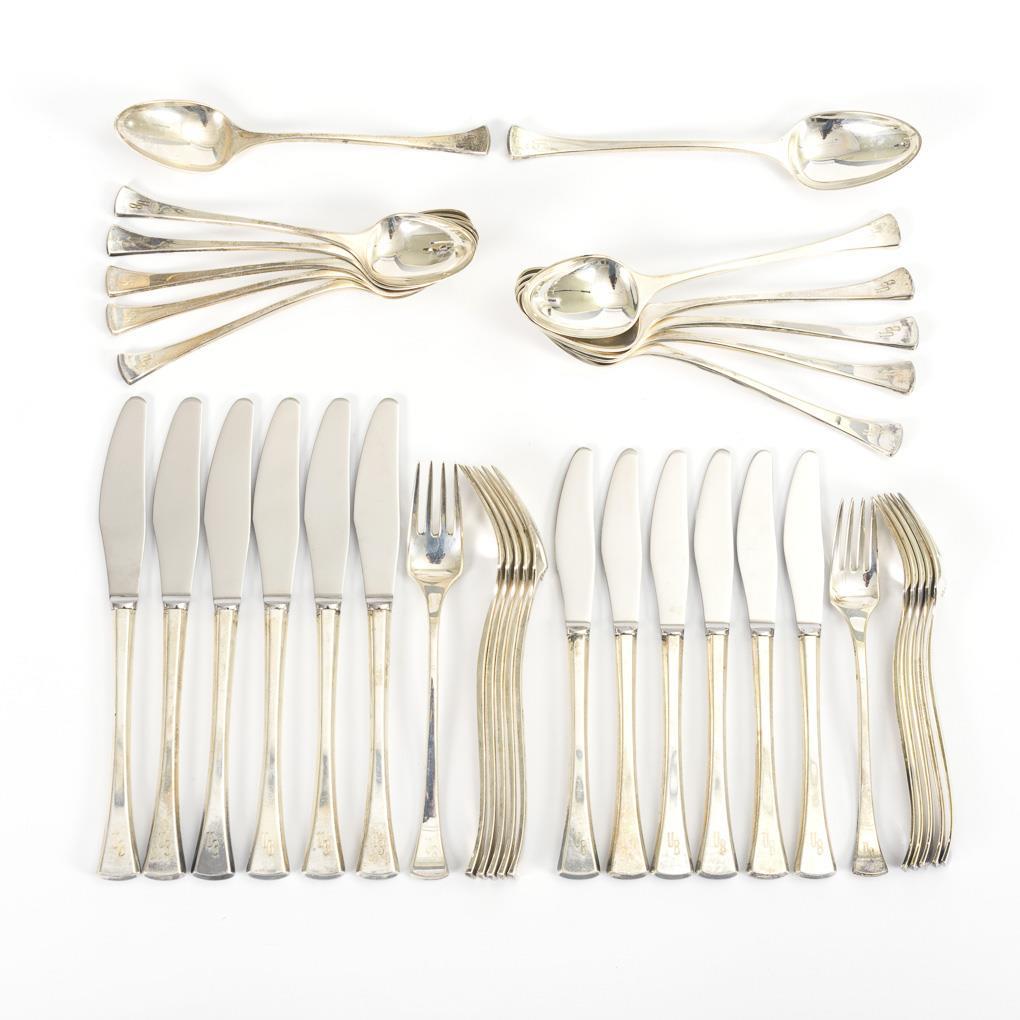 36 Teile, für 6 Personen. Designerbesteck mit Monogrammgravur "UB". Bestehend aus je 6 Menügabeln und -messern, Suppenlöffeln, Dessertgabeln und -messern, Dessertlöffeln. Kaum benutzter Zustand.