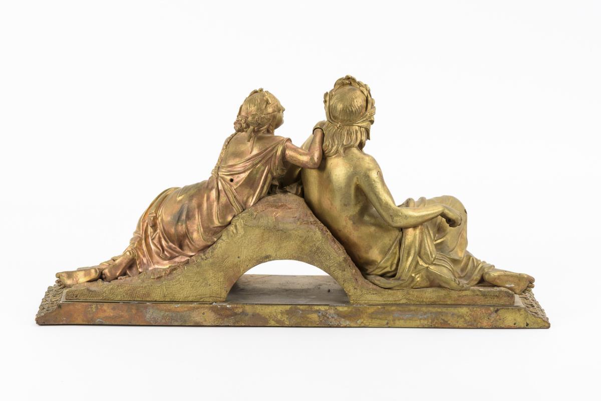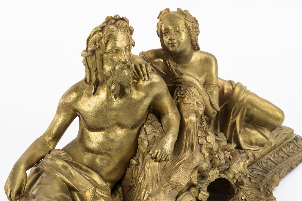 Mit vegetabilen Friesen reich reliefierte Bronze-Plinthe; darauf montierte lagernde Gestalten der Mythologie. Aus der Plinthe und Bekrönung einer Uhr gefertigt, Bohrlöcher von fehlenden Attributen, einige Gussfehler.