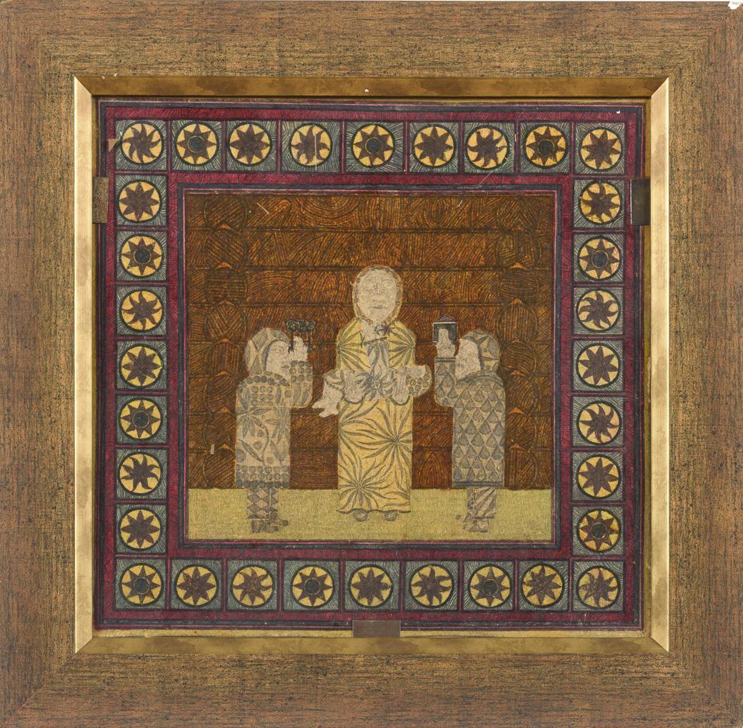 Anbetungsszene mit großer Mutterfigur mit Kind auf den Händen sowie zwei sie huldigende links und rechts.
