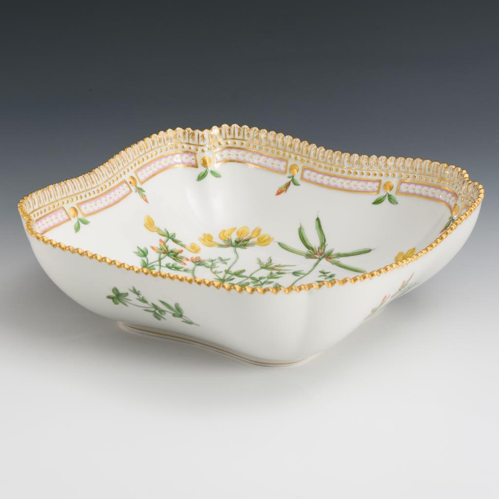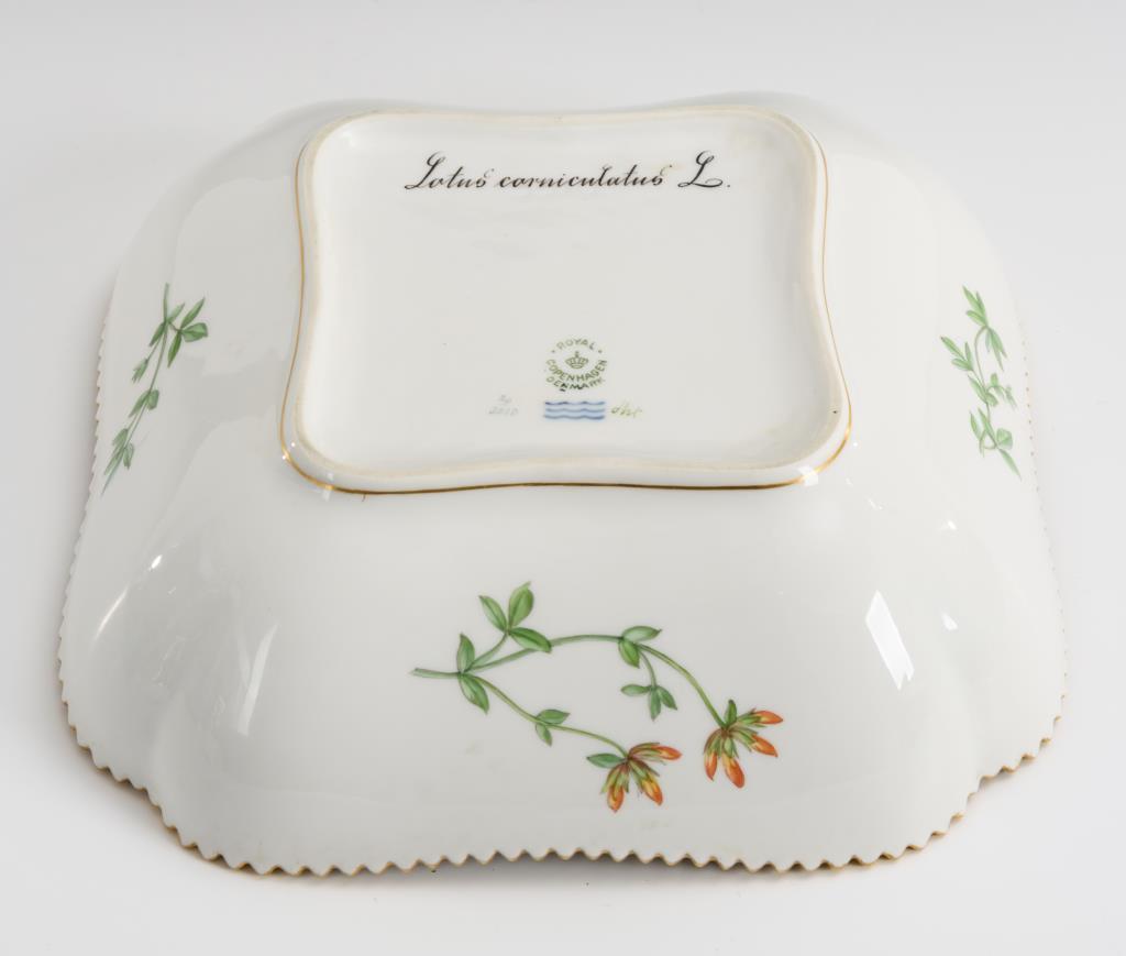 Schale mit gezacktem Rand. Im Spiegel eine fein gemalte Pflanze des gewöhnlichen Hornklees, unterseitig lateinisch bezeichnet.