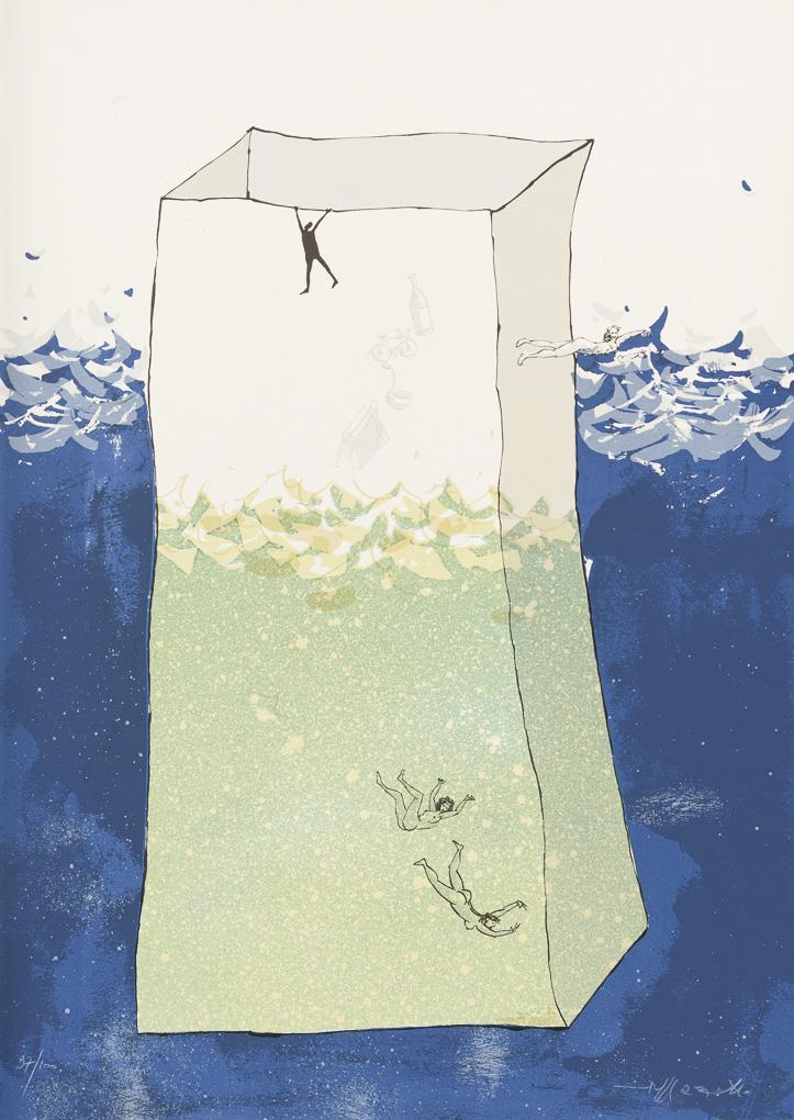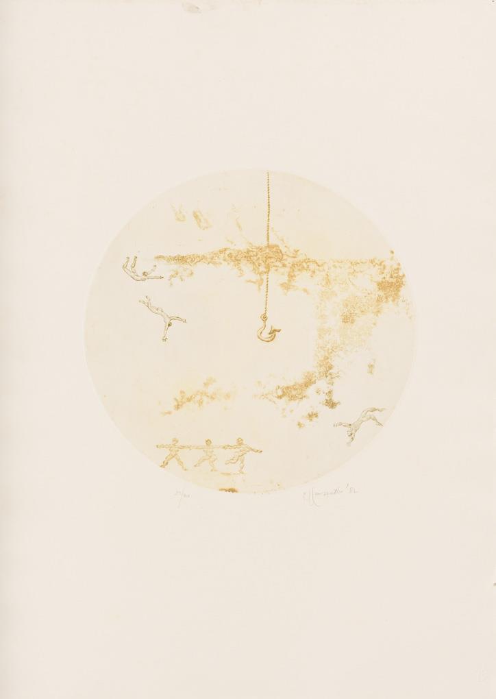 Werk mit Angelhaken und Akten, Farbradierung auf Fabriano-Bütten, Bleistiftsignatur, Platte Ø 32,5 cm, Blatt: 69,3 x 49,3 cm, Exemplar: 21/30, [19]82, Randbereich fleckig, stockfleckig | Surrealistisches Werk, Farblithografie auf Fabriano-Bütten, Stiftsignatur, Blatt: 69,5 x 49,5 cm, Exemplar: 97/100.