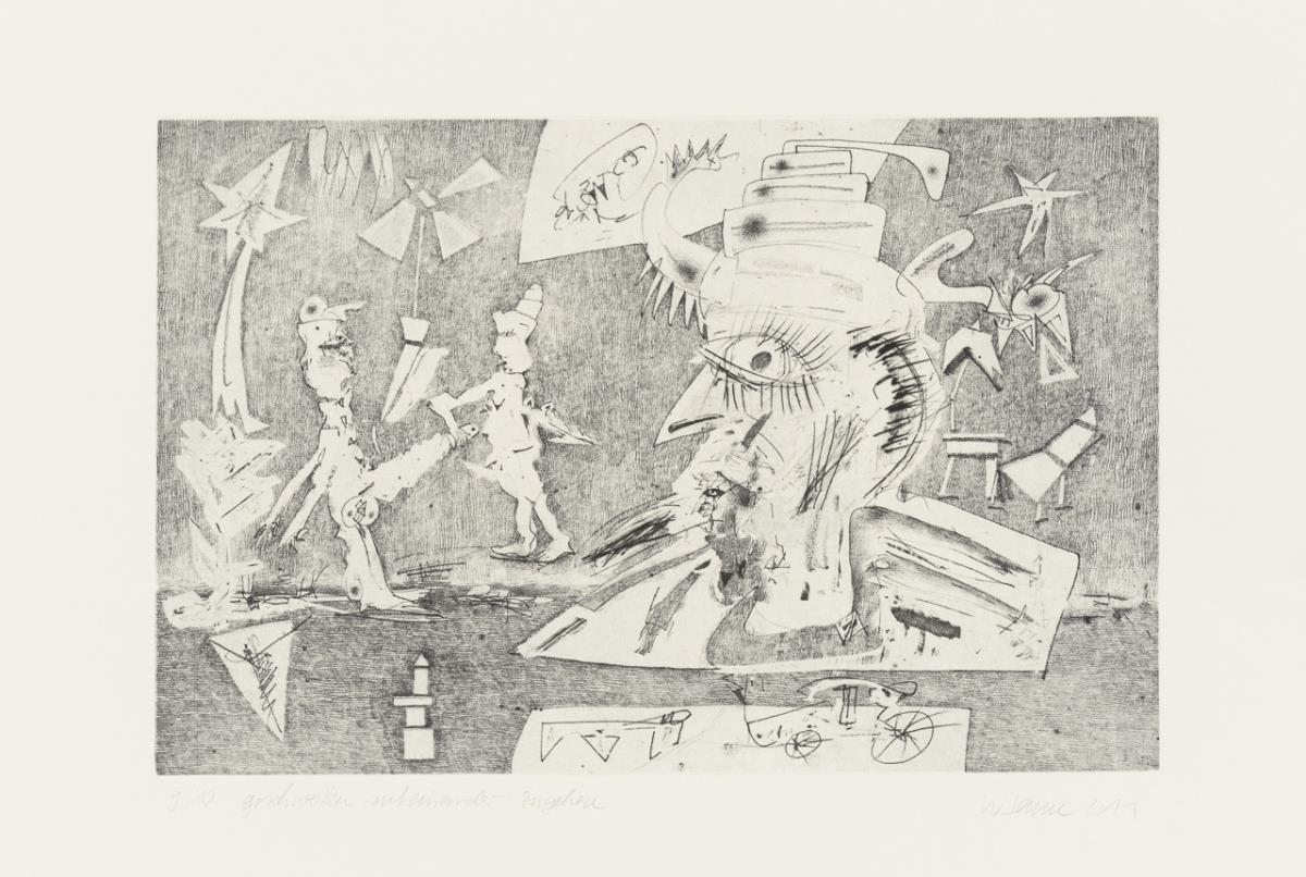 "Sternschnuppenzeit - wünsch dir was!", Platte: 29,5 x 37,6 cm, Blatt: 39,4 x 56,5 cm, Exemplar: 1/10, [19]86 | "geschwollen aufeinander zugehen", Radierung auf Somerset-Bütten, Prägestempel "Impressit Rössler Hohenossig", Platte: 32,5 x 49,5 cm, Blatt: 56,5 x 76 cm, Exemplar: 9/10, 2011, linker Rand etwas geknickt.