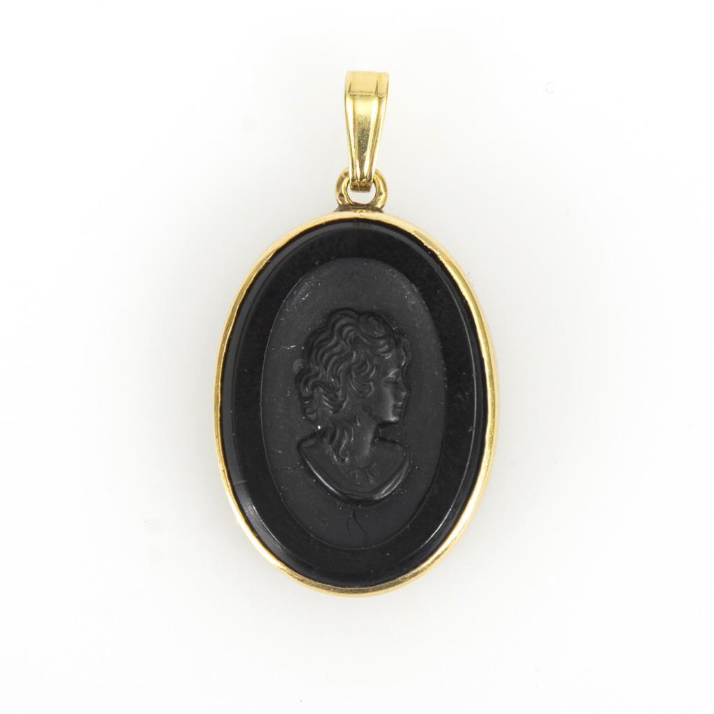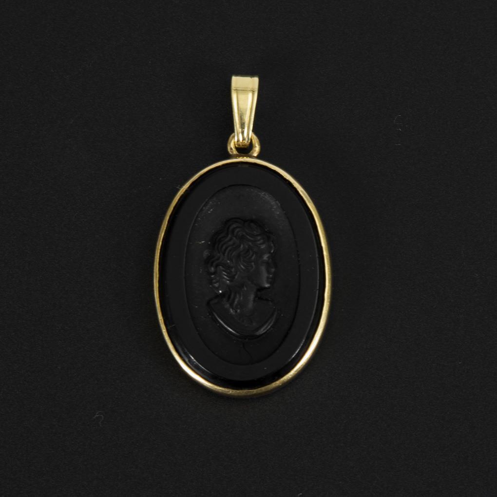 Zargengefasste Onyxtafel mit geschnittenem Mädchenprofilkopf.