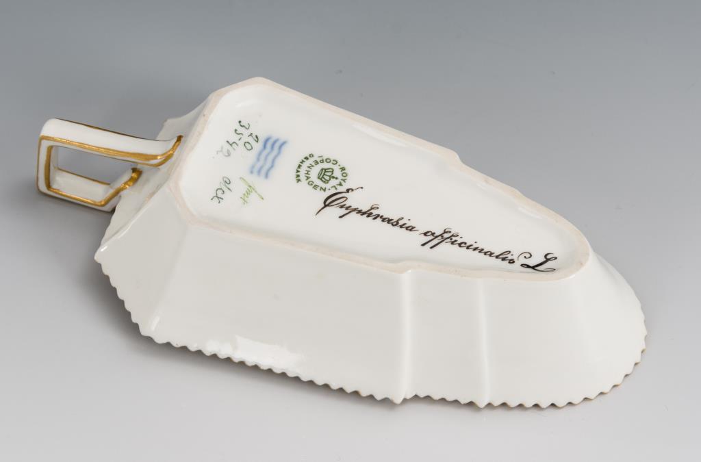 Schälchen mit gezacktem Rand und Henkel. Im Spiegel eine fein gemalte Augentrost-Pflanze, unterseitig lateinisch bezeichnet.