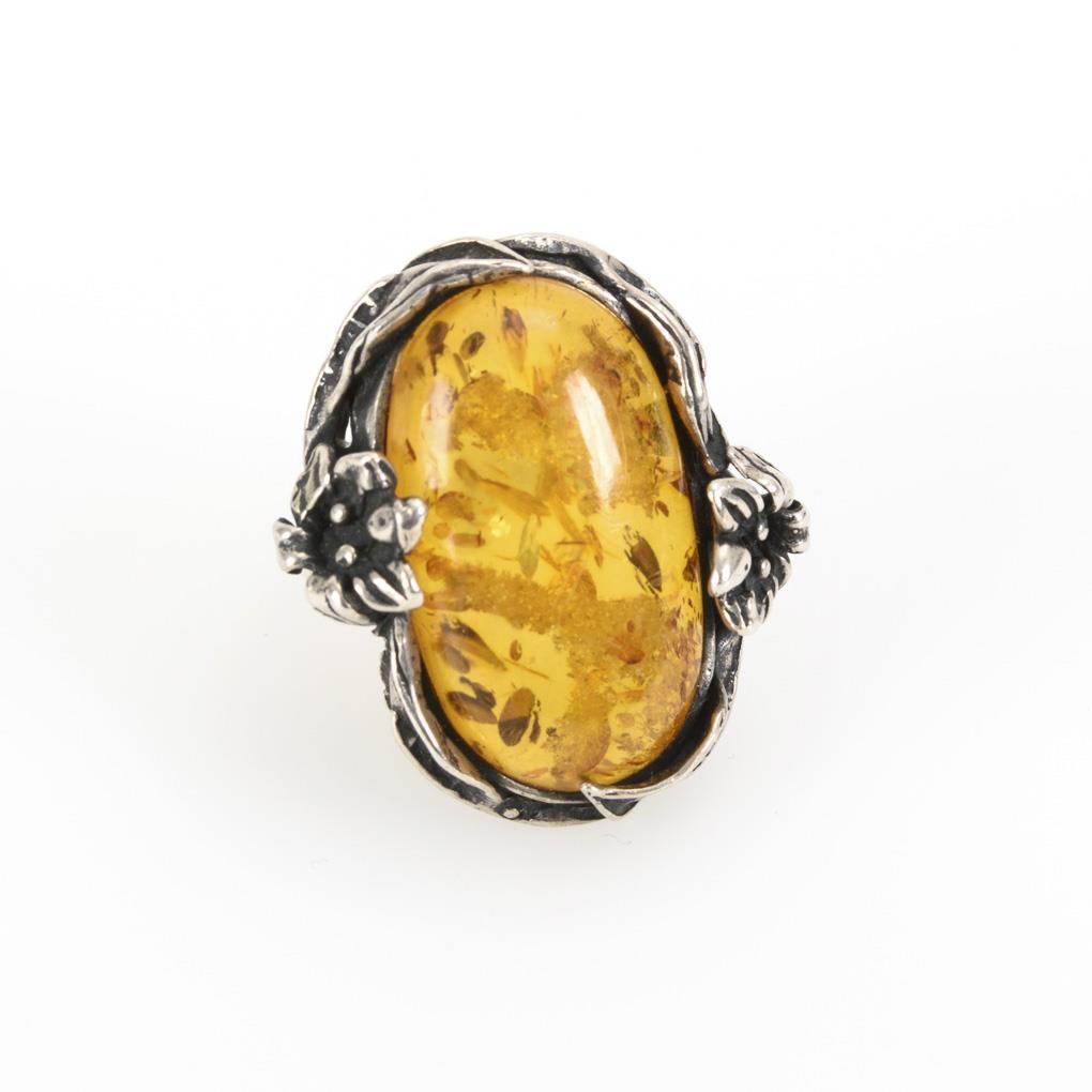 Bernsteincabochon in verziertem Ringkopf zwischen schmaler Schiene.