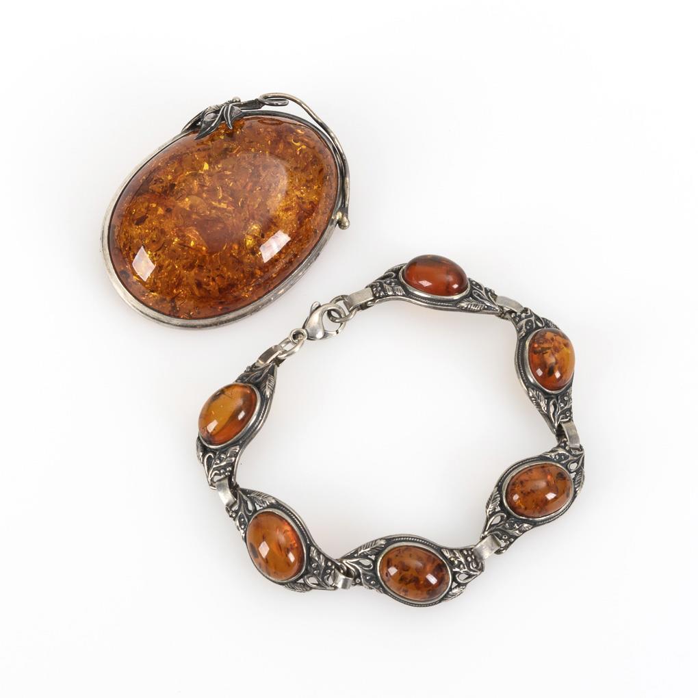 Silber geprüft. Brosche 5,5 x 4 cm. Armband L 20,5 cm. Brosche 25,6 g. Armband 20,7 g.