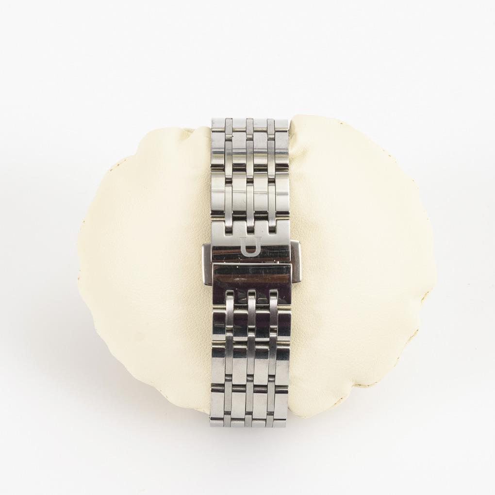 Rundes Gehäuse mit schlichter Lünette und geschwungenen Bandanstößen, geschraubter Saphirglasboden. An Gliederband mit Faltschließe, L ca. 16 cm. Minimale Gebrauchsspuren.