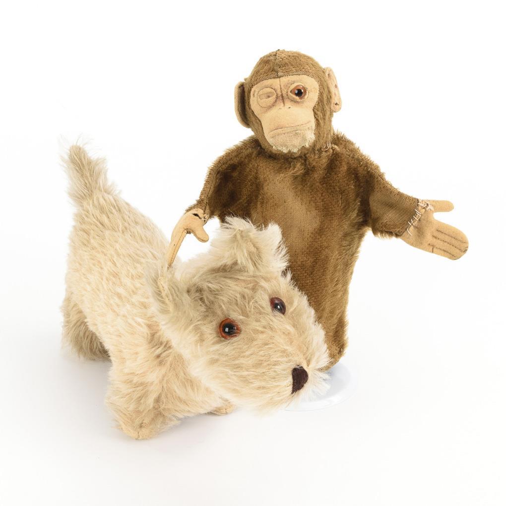 Terrier "Fox" und Steiff-Handspieltier "Jocko".