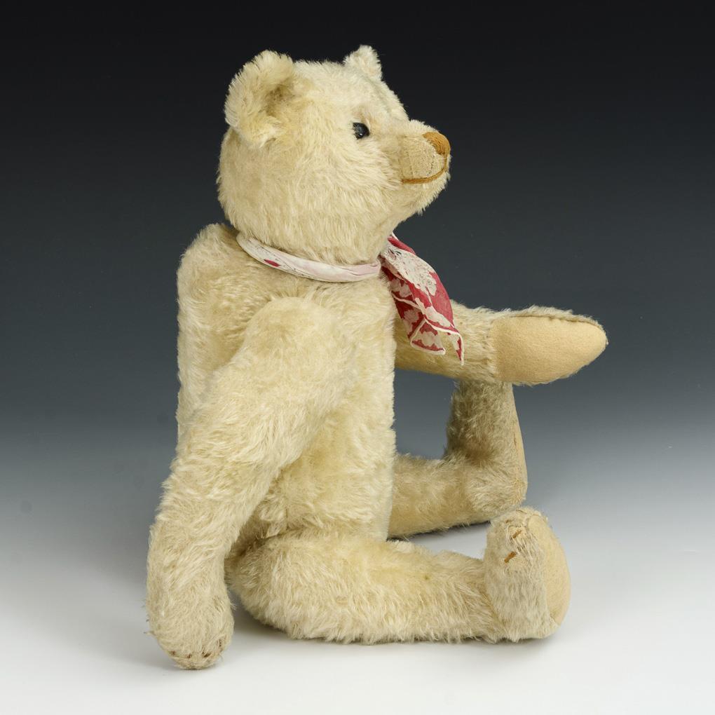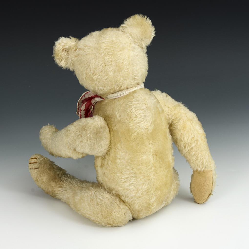 Gut erhaltener Bär mit drehbarem Kopf, Schuhknopfaugen, hell bestickter Nase und intakter Stimme. Leichte Altersspuren, kleine Kahlstellen an den Rückseiten der Beine.