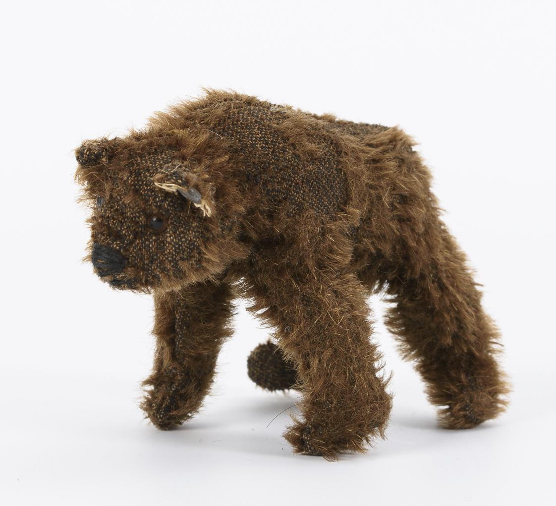 Kleiner stehender Bär mit partiell verkahltem Fell. 1 Auge trüb, Gummischnur fehlt.