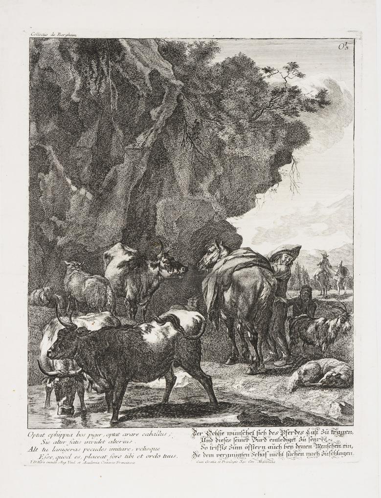 Nach einem Gemälde von Nicolaes Pietersz. Berchem (1620 - 1683), Namenszüge der Künstler in der Platte. Blatt beschnitten, horizontale Bugfalte, etwas stockfleckig.