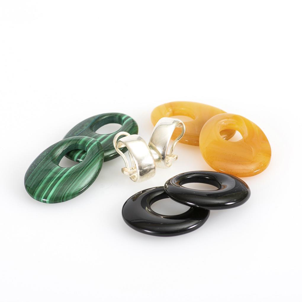 Halbcreole mit Klippmechanik. Dazu Einhängeringe aus Onyx, Malachit und Achat.
