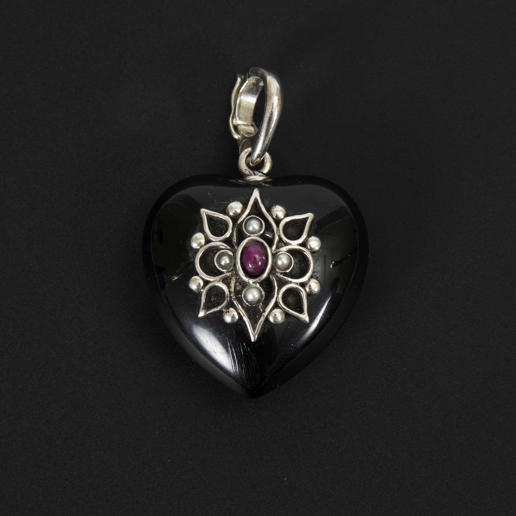 Plastisches Steinherz mit kleinem Rubin und 4 Perlchen. Klippöse mit Achtersicherung.