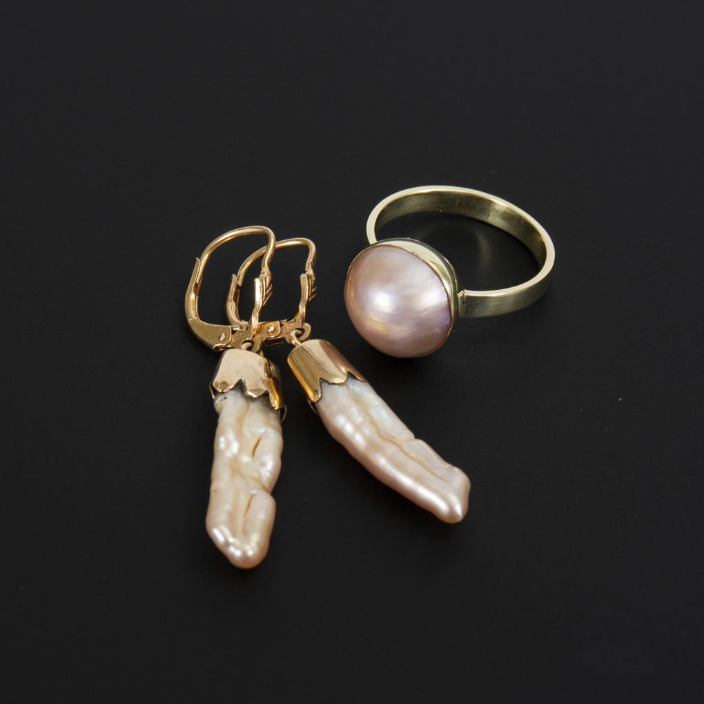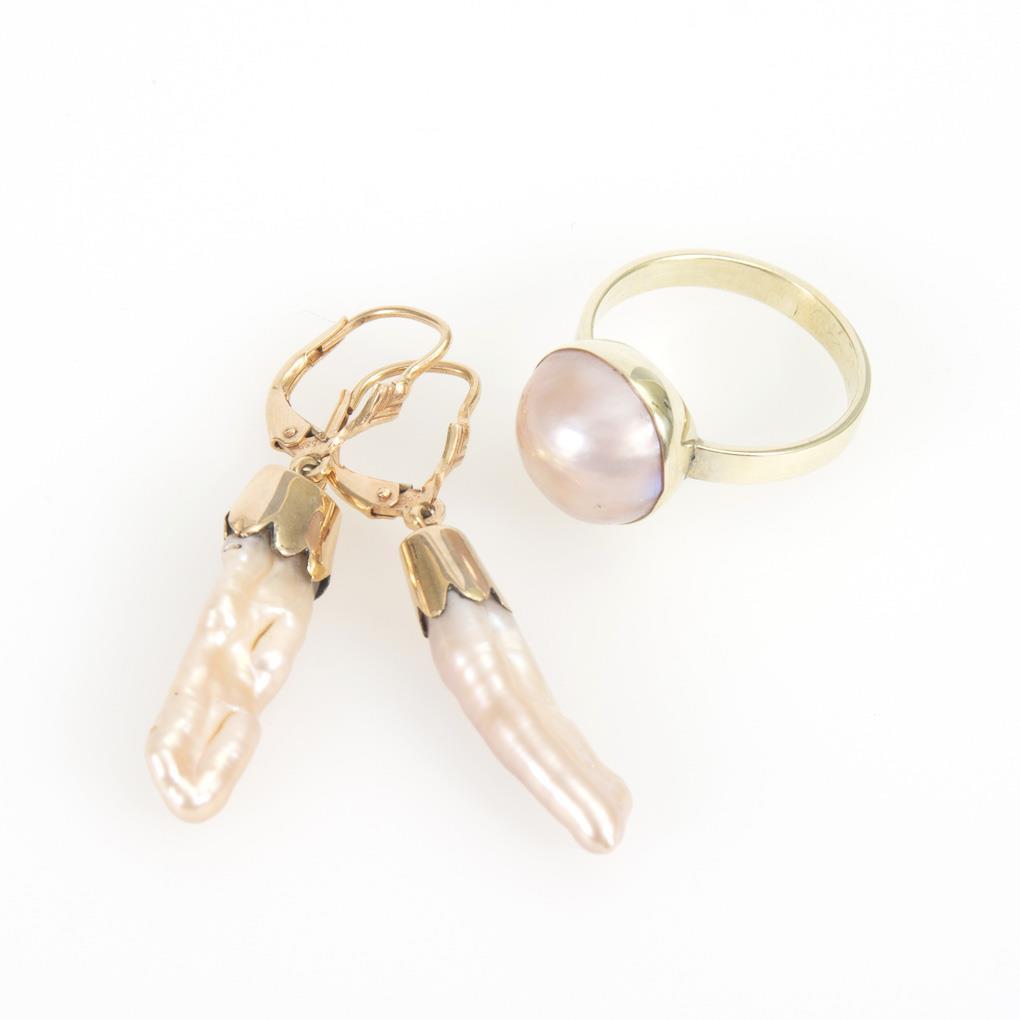 Ring mit Mabézuchtschalenperle und Ohrhängerpaar mit Zuchtperlen.