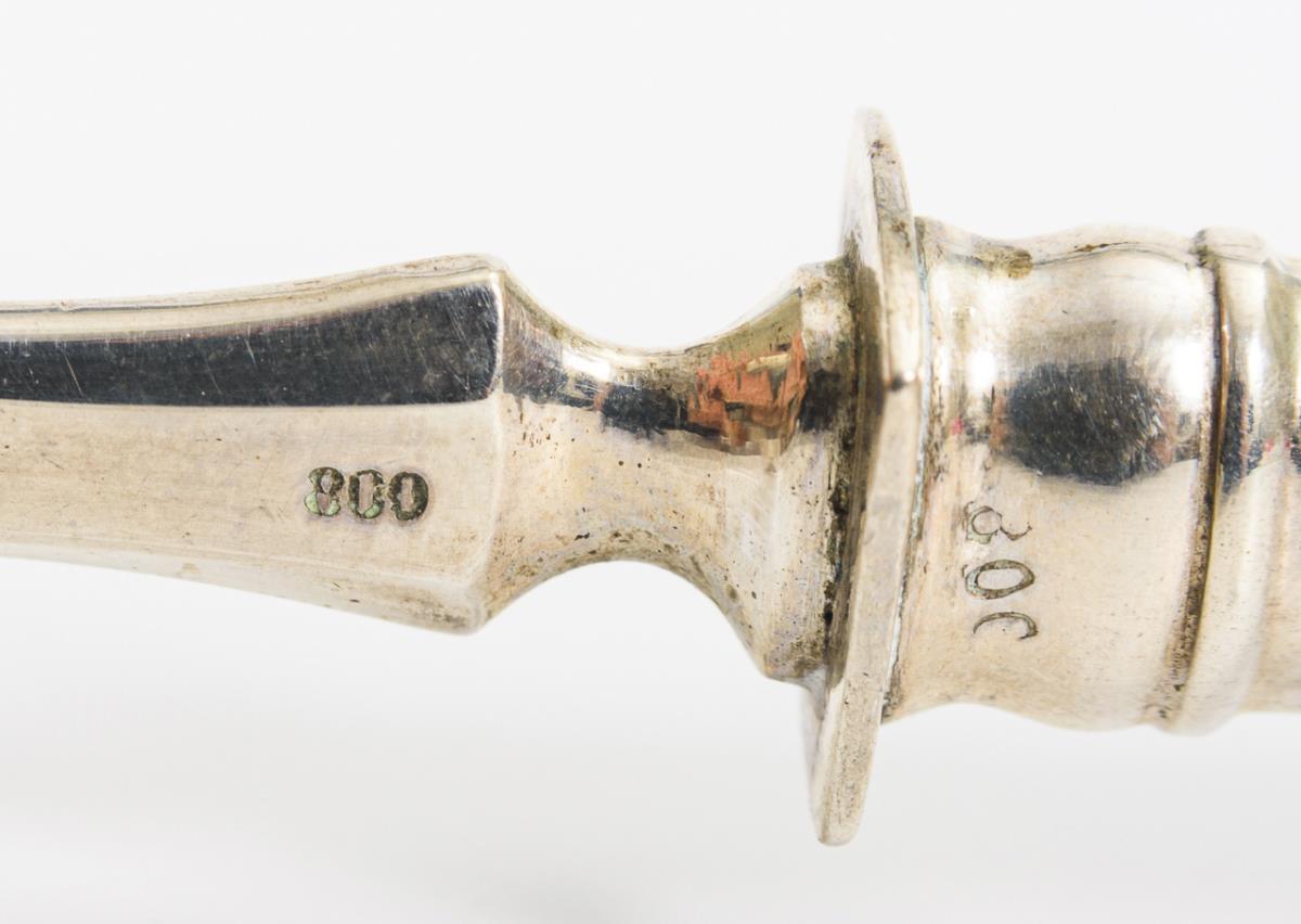 6 Messer und 6 Gabeln mit gefüllten Griffen, beidseits mit Barockornament reliefiert, je Monogrammgravur "HB". Klingen beidseitig mit Fisch, Zinken einseitig mit Ranken graviert. Einige wenige Gebrauchsspuren am Etui.