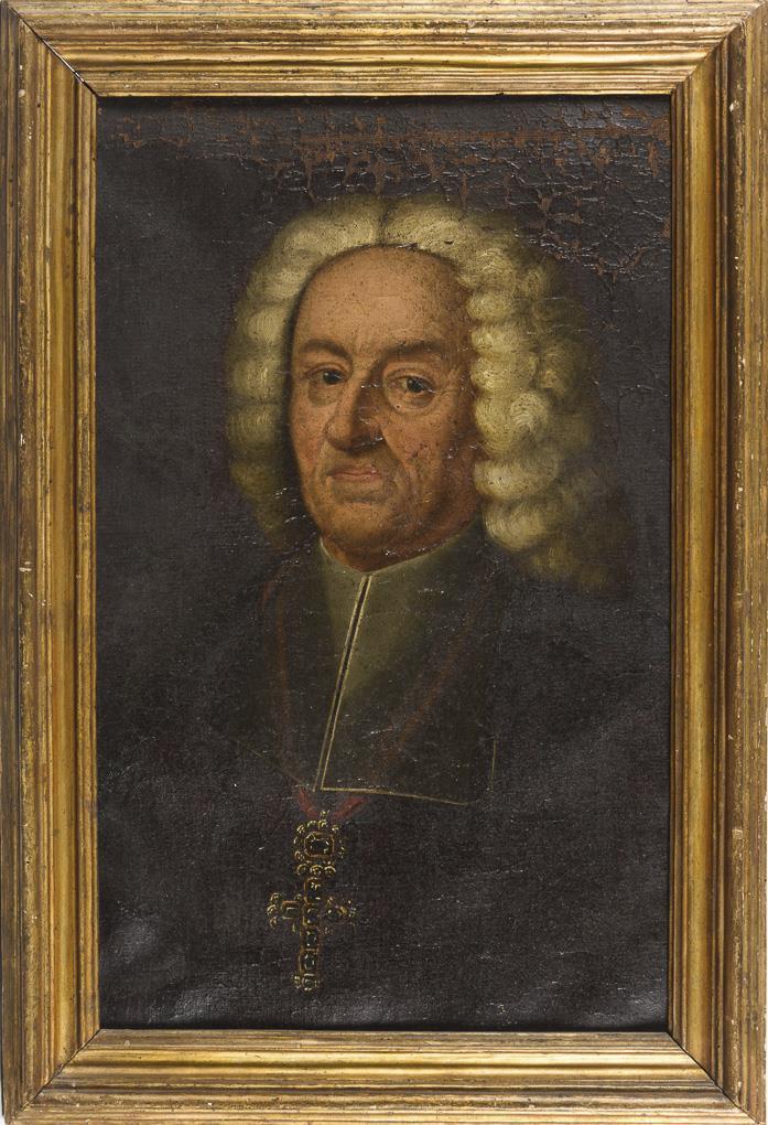 Bildnis eines älteren Mannes mit Allongeperücke und schwerem goldenem Kreuzanhänger. Restaurierungsbedürftig.