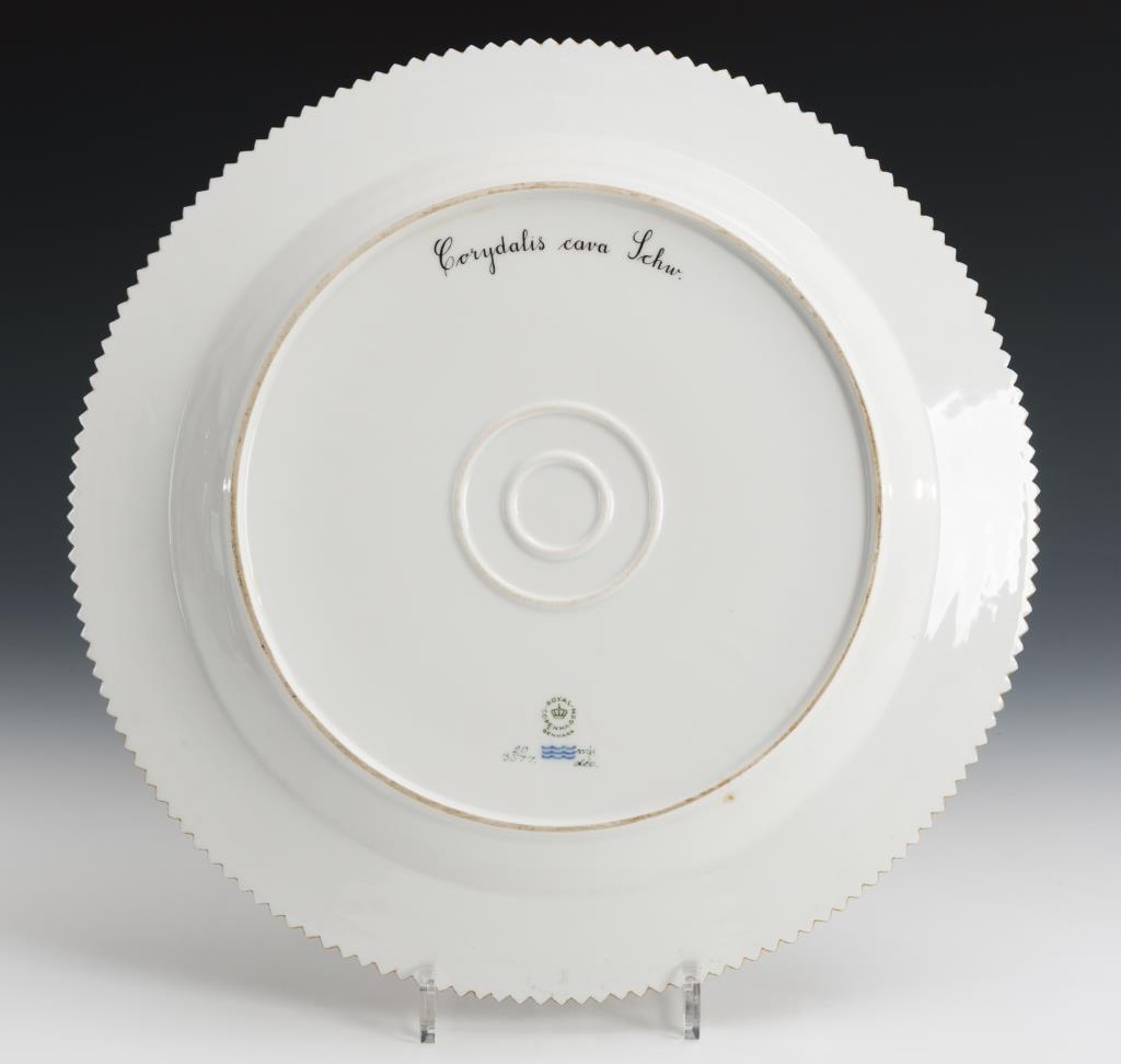 Runde Platte mit gezacktem Rand. Im Spiegel eine fein gemalte Lerchenspornpflanze.