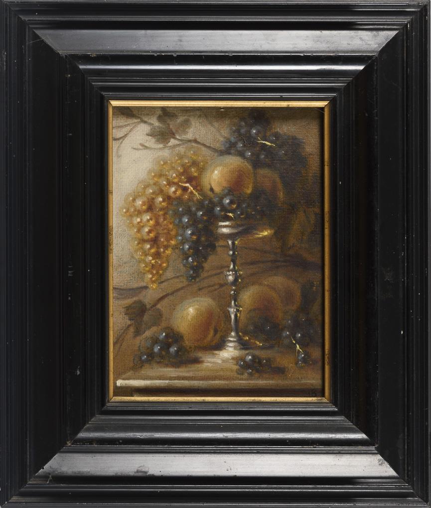 Silberne Fußschale mit Trauben und Pfirsichen auf einem Möbel mit weiterem verstreut liegendem Obst. Eine Bestoßung.