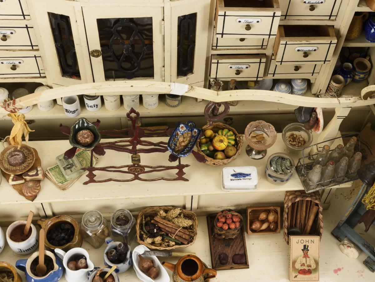 Trapezförmiges Gehäuse mit 2 Frontlisenen und fester Ladeneinrichtung: Regal mit 4 verglasten Türen und 12 beschrifteten Schüben, lose eingestellte Theke mit Bekrönung. Reich ausgestattet mit Waage, Kassenrolle, Holzständer, Wandregal sowie zahlreichem Zubehör aus Porzellan und Blech. Bespielt, leichte Altersspuren.