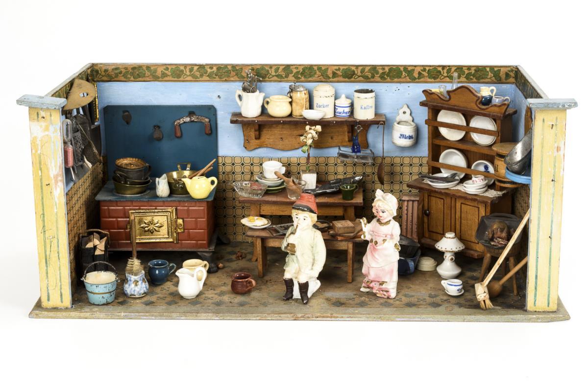 1-Raum-Gehäuse mit Blechherd, Schrank, Tisch, Bank und Wandbord. Dazu zahlreiches Zubehör aus Blech und Porzellan sowie 2 Biskuitfigürchen. Bespielt, Altersspuren.