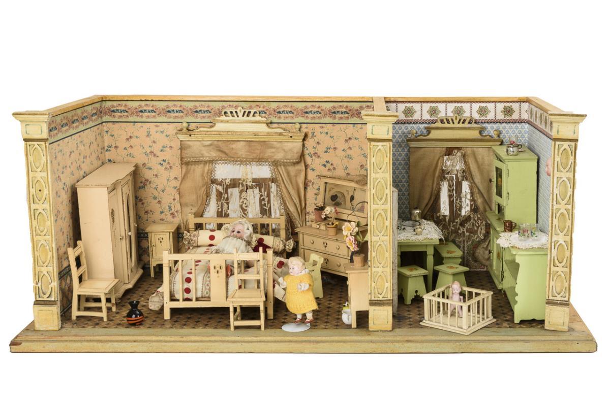 2-Raum-Gehäuse mit durchbrochen gearbeiteten Frontstützen, 2 mehrteiligen Fenstern, Gardinen und Tür mit Supraporte. Eingerichtet mit weißen Schlafzimmermöbeln und grünen Küchenmöbeln. Dazu 3 Püppchen. Altersspuren, Bett defekt, Küche wohl jünger tapeziert.
