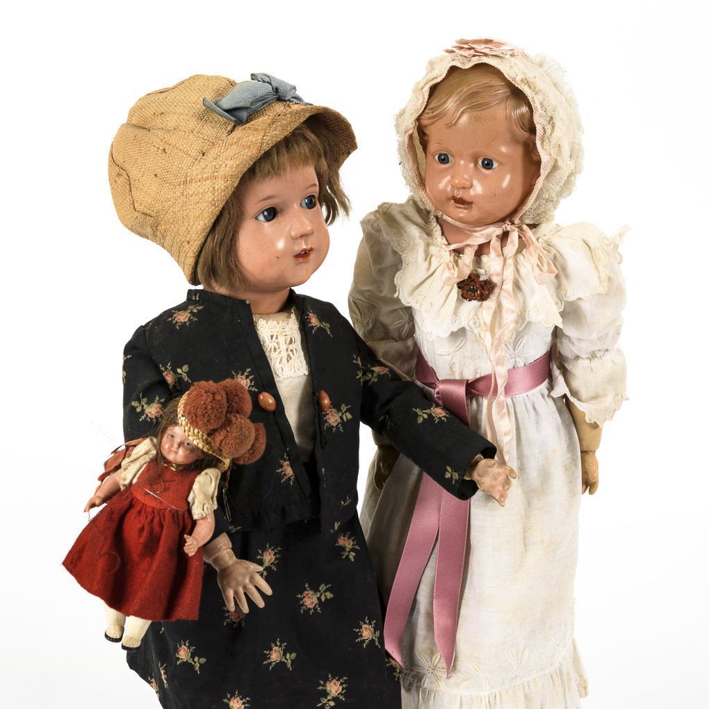 Charaktermädchen mit Kurbelkopf, blauen Schlaf-Schelmenaugen, festgeklebter blonder Mohairperücke und schwarzem Kostüm mit Blumenmuster. Dazu kleine Schildkröt-Trachtenpuppe. / Frühes Brustkopfmädchen mit blauen Glasaugen, modellierten Haaren und weißem Kleid mit Haube. Beide mit Wachstuchkörper und Gliederarmen. 1x kleine Defekte in den Mundwinkeln, 1x Ohren mit Kleberesten, Gesichter minimal berieben.