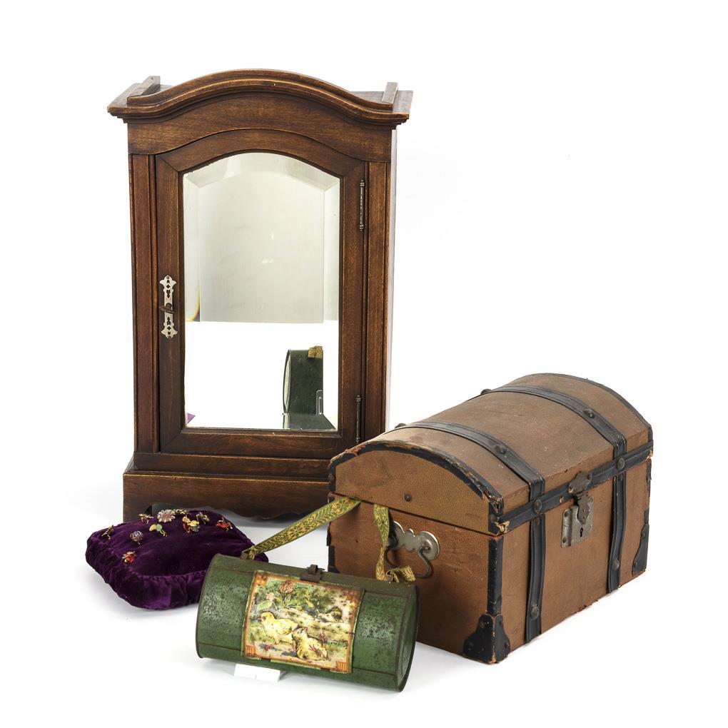 Puppenschrank Nussbaum, Tür mit facettiertem Spiegelglas, innen 1 Schub, Schloss klemmt. Truhenförmiger Reisekoffer mit 2 Griffen und Schloss. Darin violettes Samtkissen mit 10 Blütenbroschen. / Grüne Botanisiertrommel mit geprägtem Frontbild (L 18,5 cm). Altersspuren.