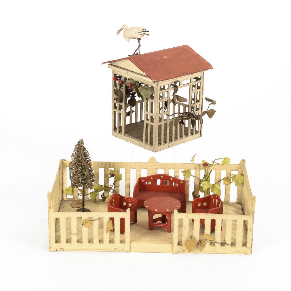 Umzäunter Garten mit Laube, 5 rot lackierten Möbeln und Celluloid-Storch auf dem Dach. Leichte Altersspuren.