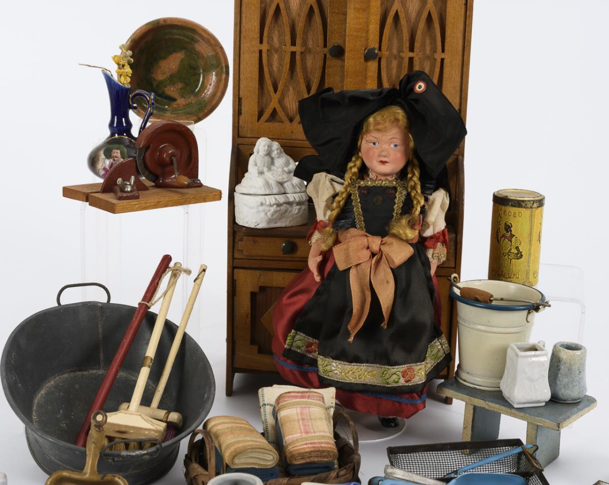 Heller Schrank mit durchbrochen gearbeiteter Front. / Französisches Celluloid-Püppchen in Elsässer Tracht (L 24 cm). / Zahlreiches Zubehör, darunter Brotmaschine, Würstchendose, Korb mit Stoffballen, Vasen, Teller, Bürsten etc. Bespielt, Altersspuren, kleine Defekte, Schrank mit Ergänzungen.