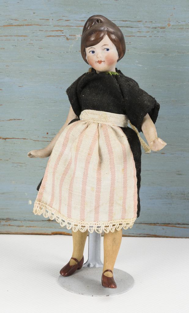 Trapezförmiges 1-Raum-Gehäuse, als Wäscherei eingerichtet: Waschkessel, Wäschemangel, Bügeleisen, Wäscheleine mit Wäsche und weiteres Zubehör. Dazu 1 Ganzbiskuitpüppchen mit Schürze. Bespielt, Altersspuren.