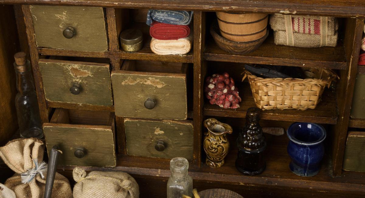 Trapezförmiges Gehäuse mit gedrechselten Frontsäulen und beschrifteter Bekrönung "Colonialwaaren". Fester Ladeneinbau mit 10 Schüben, lose Theke, zahlreiches Zubehör, darunter Stoffballen, Säcke, Flaschen, Krüge etc. Altersspuren, Lackdefekte.