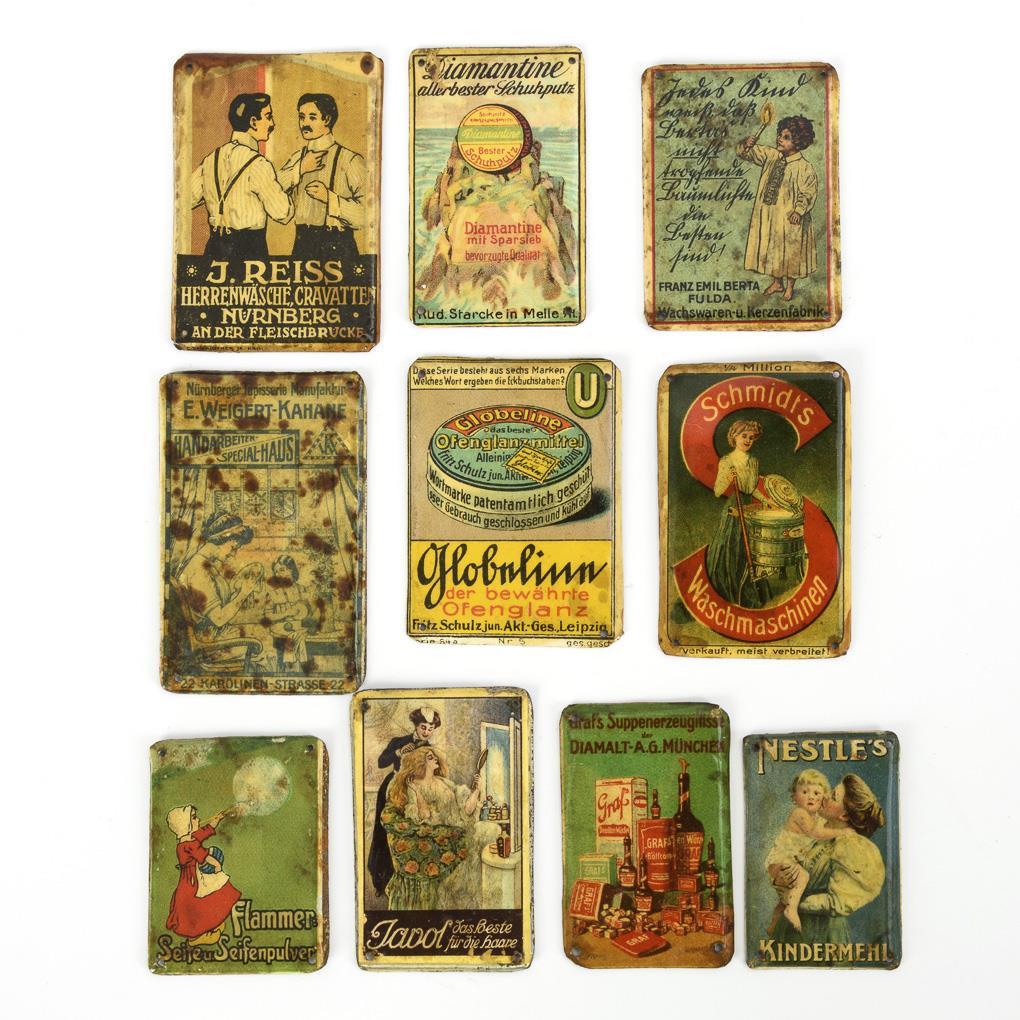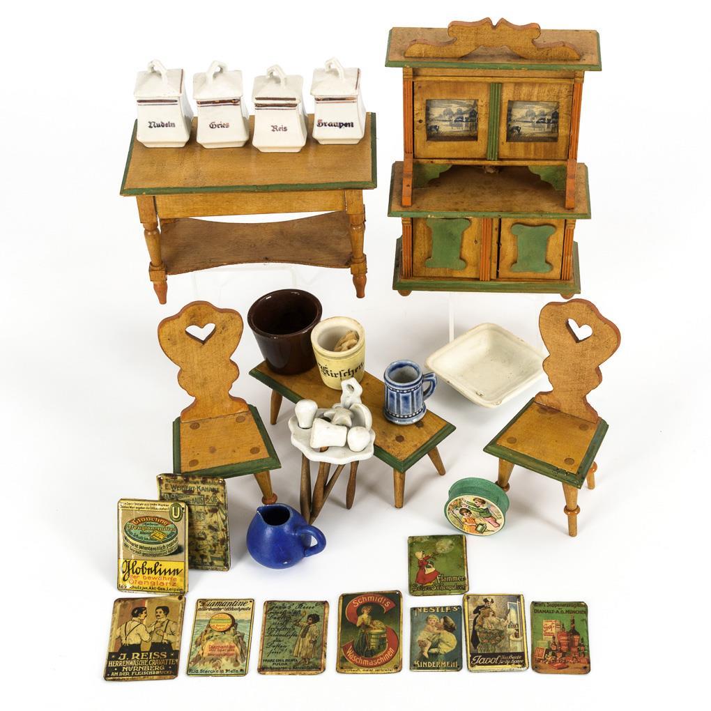 Küchenbuffet, Tisch, Bank und 2 Bauernstühle. Dazu 4 + 1 Vorratsdosen, Bierkrug und Wandhalterung mit Küchengeräten, als Zugabe 10 Miniaturwerbeschilder Blech, Replikas.