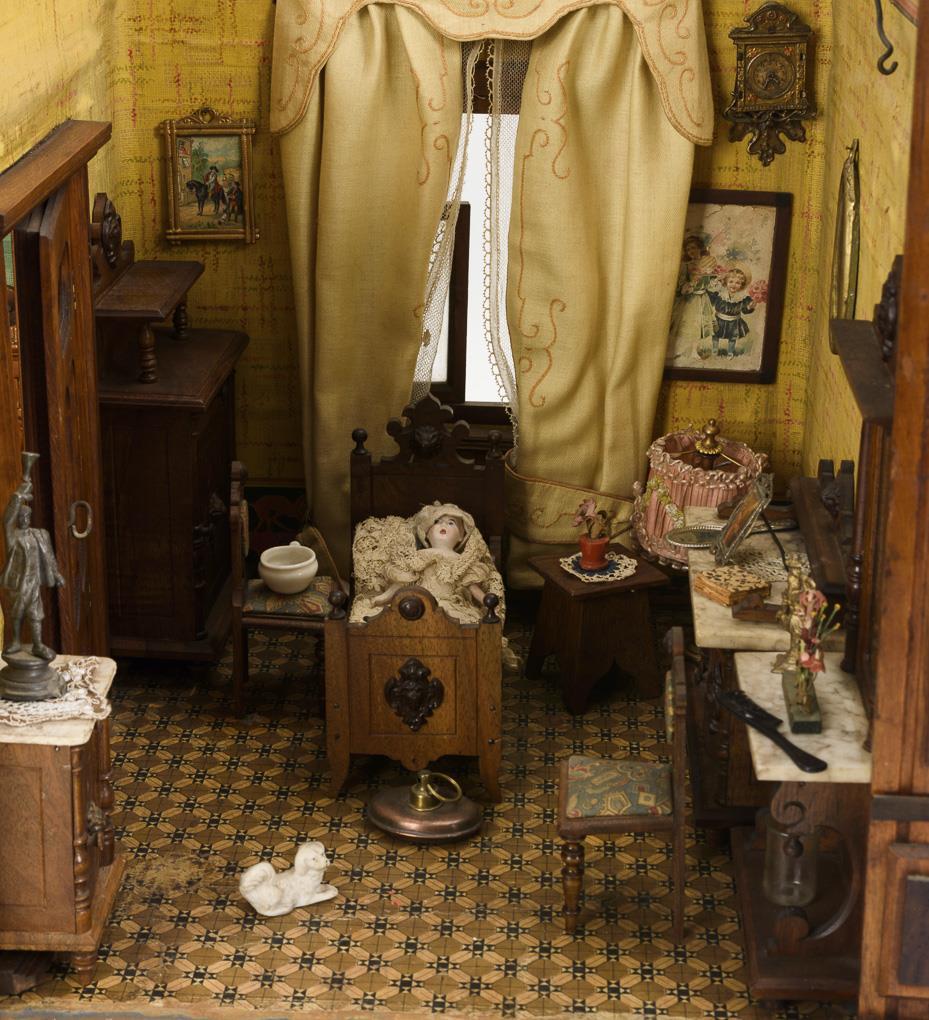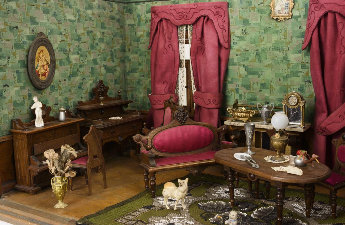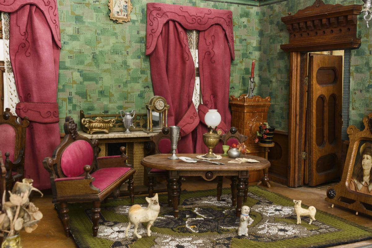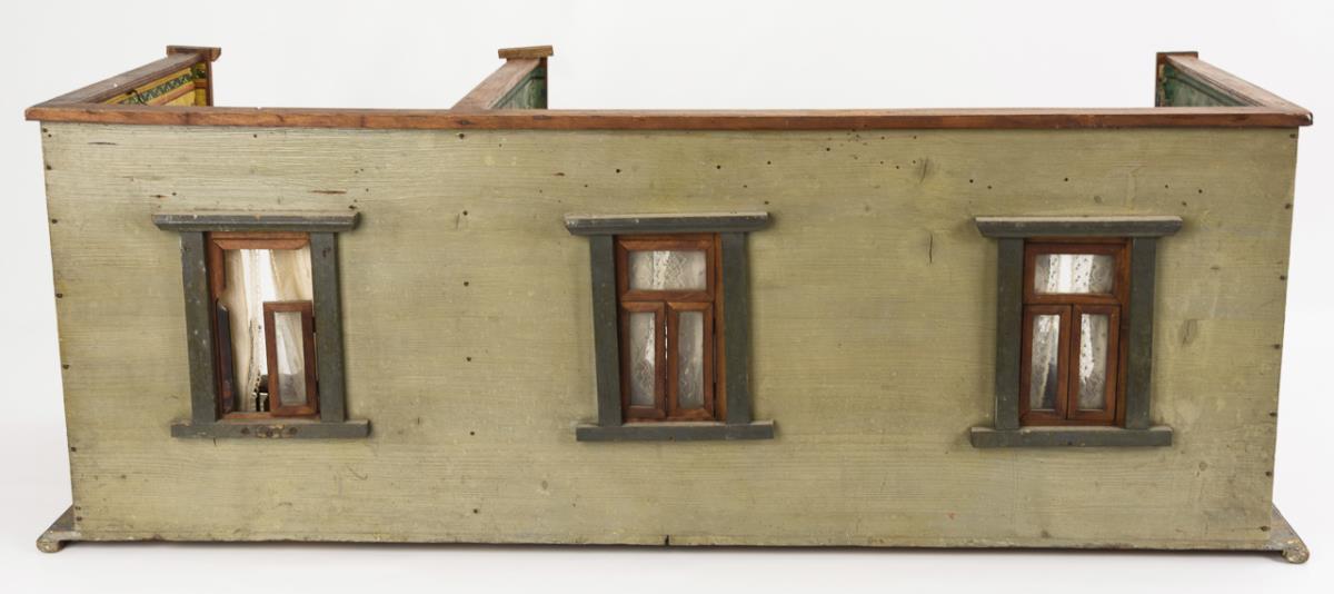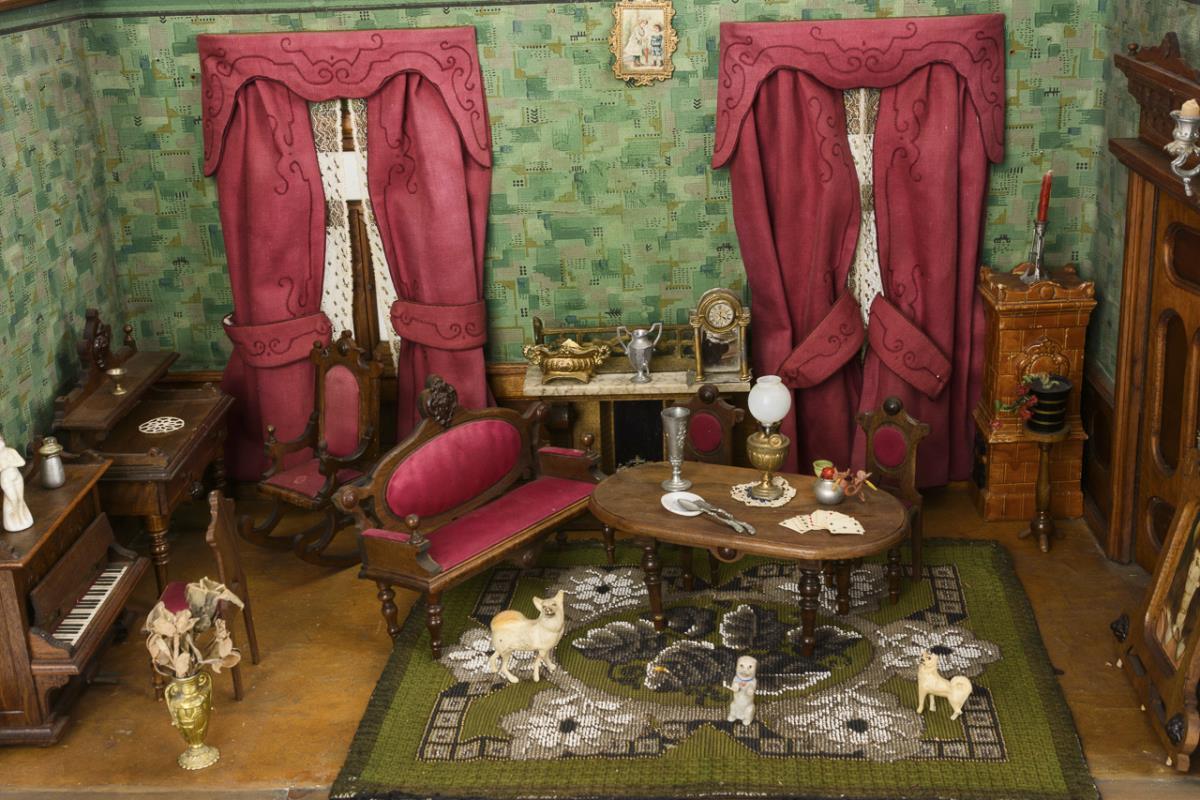 2-Raum-Gehäuse mit 3 verglasten Fenstern, Gardinen und Zwischentür mit Giebelbekrönung. Eingerichtet als Wohnstube und Schlafzimmer mit Harras-Möbelprogramm, Kachelofen, Kamin, Klavier, Uhren, Bilderrahmen und zahlreichem Zubehör. Bespielt, Spuren von Feuchtigkeit, 1 Fenster defekt.