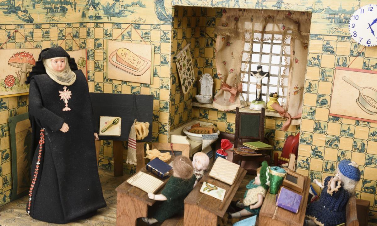 Kleines 1-Raum-Gehäuse mit vergittertem Fenster im Erker. Eingerichtet als Schule mit 3 Bankreihen, Tafel, Rechenschieber und Zubehör. Dazu Benediktinerin mit Celluloidkopf als Lehrerin und 4 Schüler-Püppchen. Altersspuren, kleine Defekte.