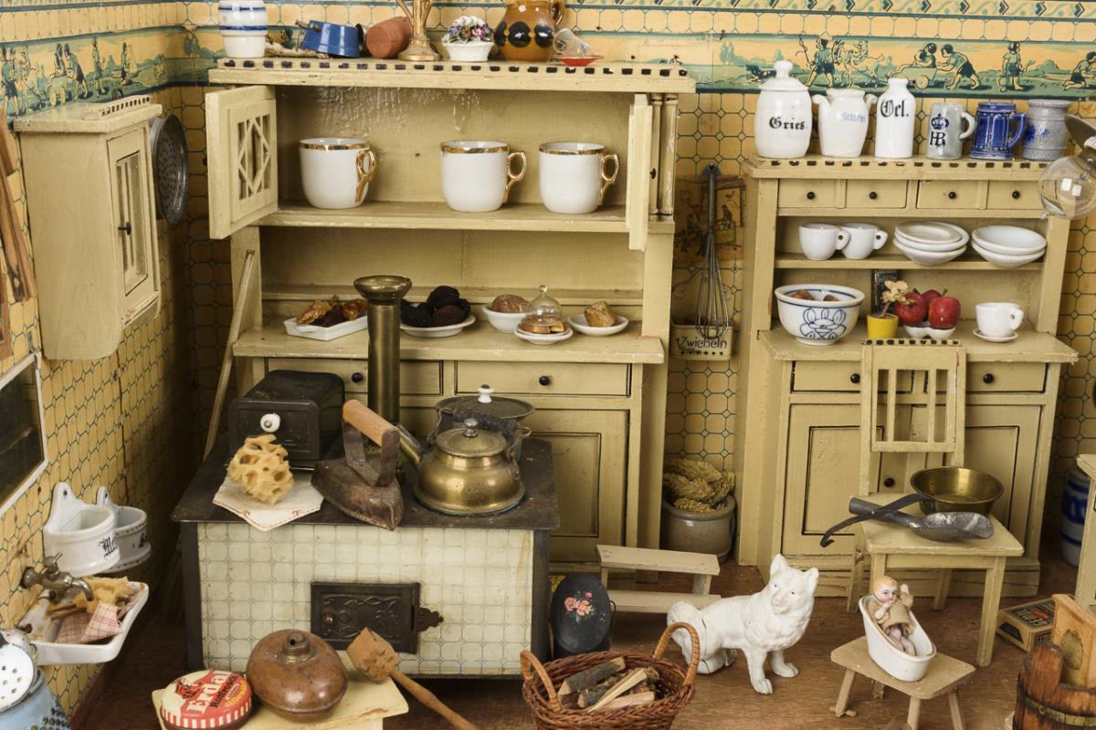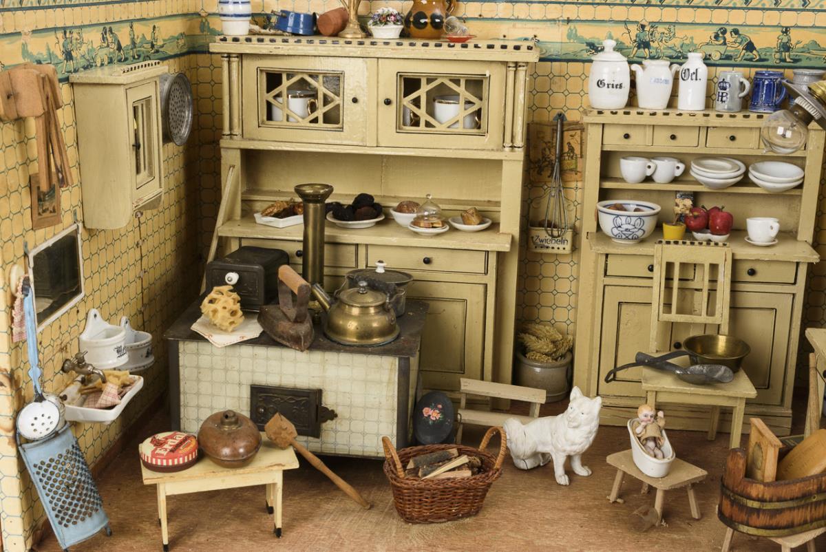 1-Raum-Gehäuse mit 2 seitlichen Tragegriffen. Eingerichtet mit Blechherd, 7 weißen Möbeln und zahlreichem Zubehör aus Porzellan, Metall und Holz. Bespielt, Altersspuren.