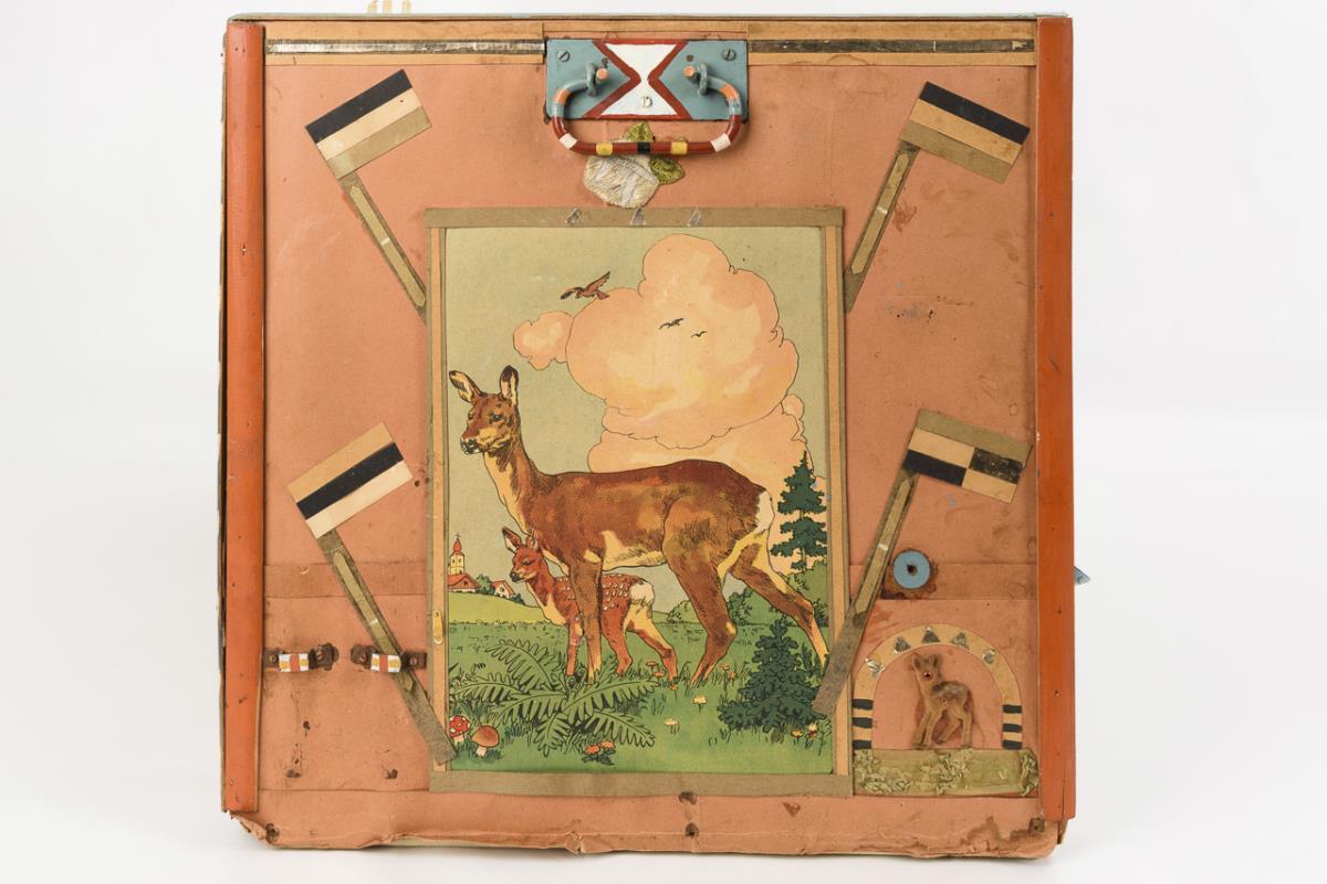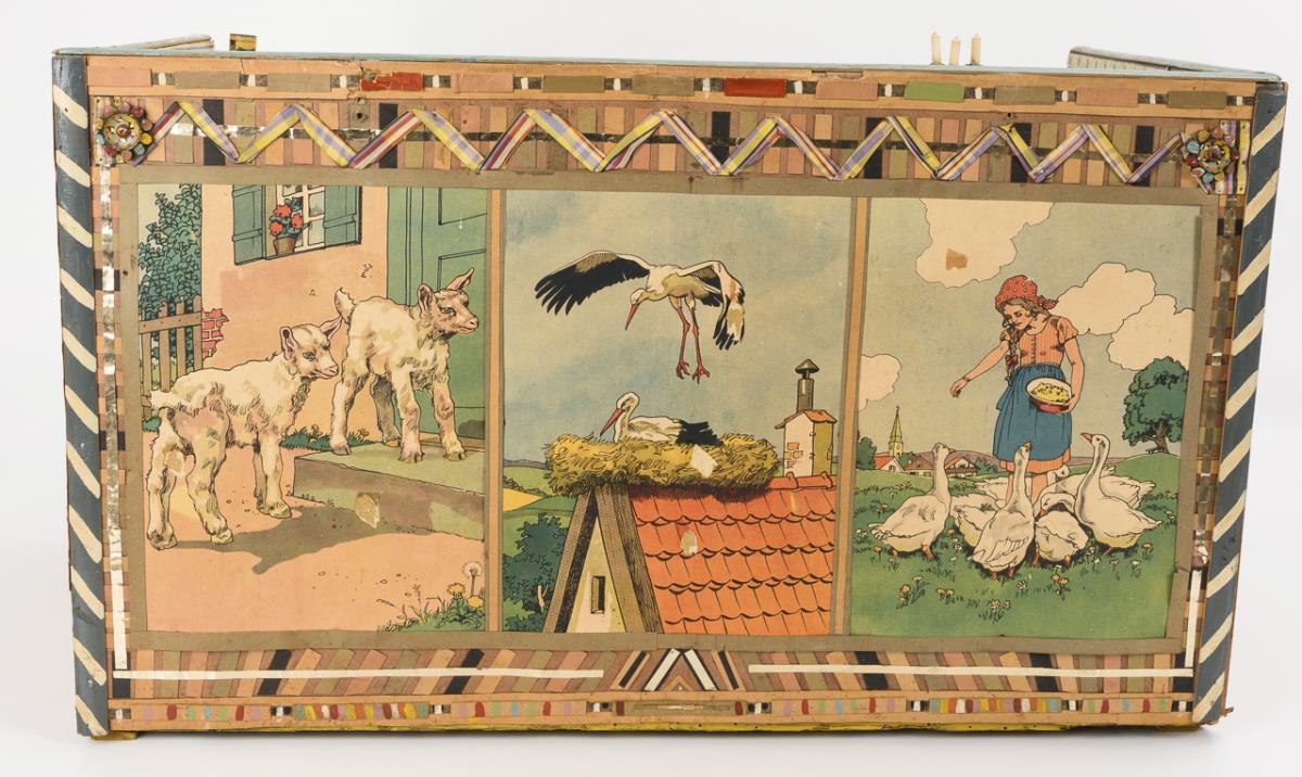 Holz, innen jünger tapeziert im Delfter Stil, außen von Kinderhand dekorativ beklebt. 41,5 x 71 x 41 cm.