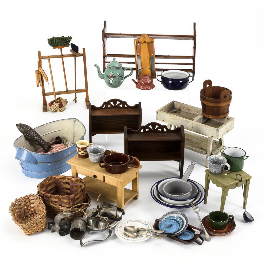 7 Möbel für die Puppenküche (3 Regale, Besenhalter, Zuber etc.), blaue Blechwanne, 3 Körbe, zahlreiches Emailgeschirr und Zubehör. Als Zugabe 1 defekter Stuhl. Altersspuren, teils mit Defekten.