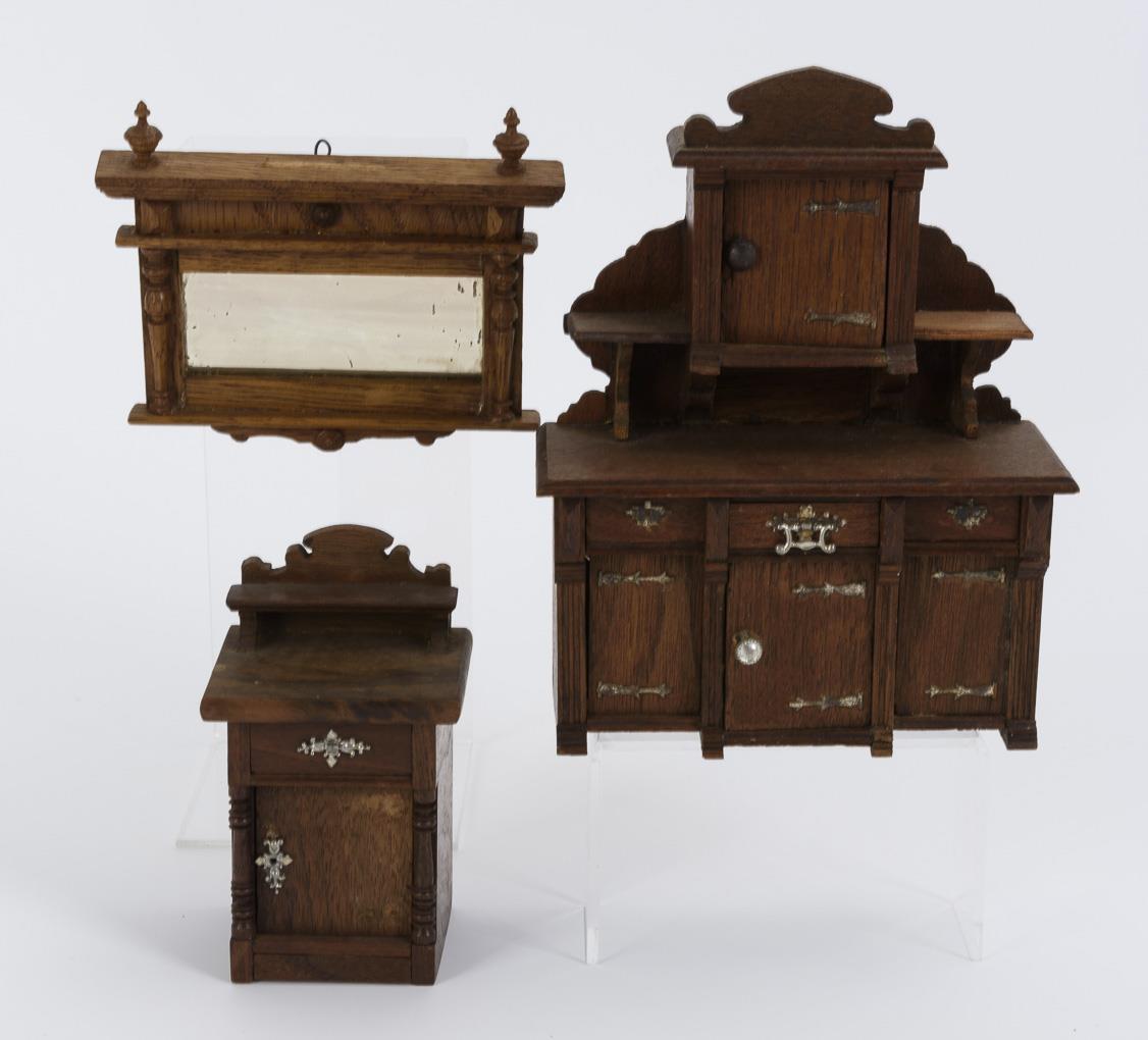 Anrichte, Beistellschränkchen, Tisch, rotes Sofa und Wandspiegel. Dazu etwas Zinngeschirr, 1 kleiner Blechherd. Altersspuren, Reparaturstellen.