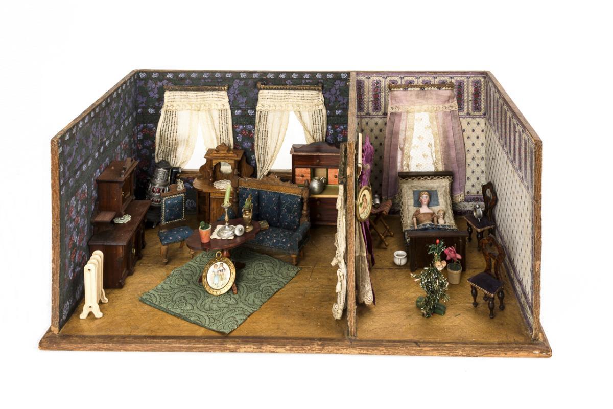 Schlichtes Gehäuse mit 3 verglasten Fenstern, offenem Durchgang und Gardinen. Eingerichtet als Stube und Schlafzimmer mit Kanonenofen, Heizkörper und Weihnachtsbäumchen. Dazu 2 defekte Püppchen. Altersspuren.