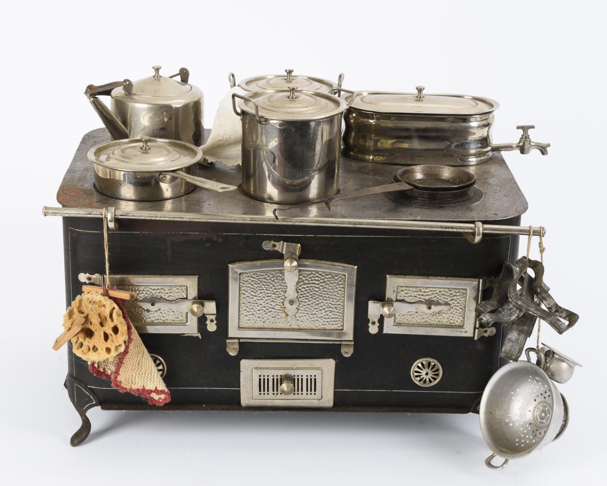 Großer dekorativer Puppenherd mit Zubehör.