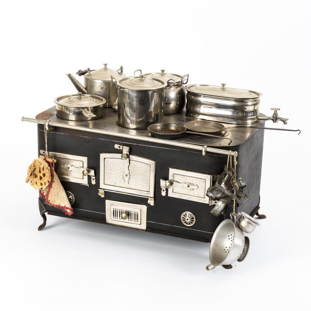 Schwarzer Herd mit 6 Kochstellen, 3 Ofenklappen und herausziehbarem Brenner. Dazu Wasserschiff, Kessel, 3 Töpfe, 2 Pfannen und etwas Zubehör. Leichte Altersspuren, etwas Rost.