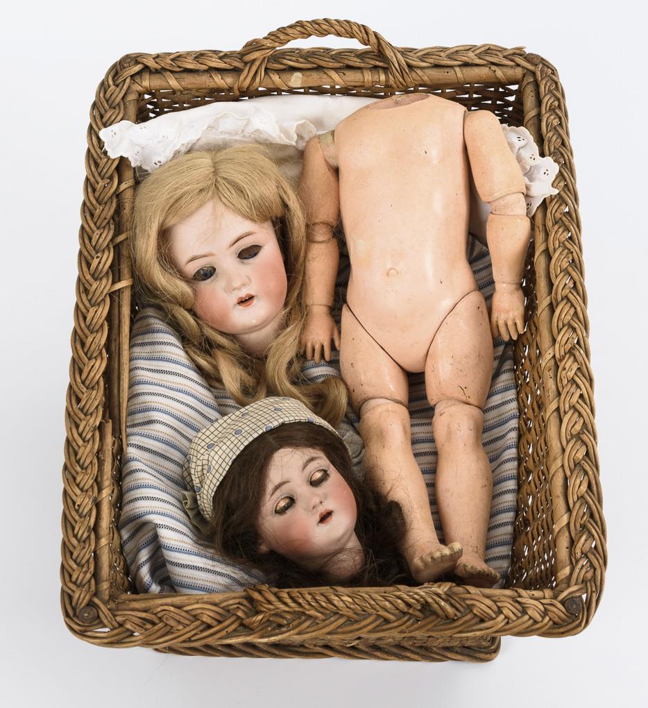 Toddlerkörper und 2 Puppenköpfe in altem Weidenkorb.